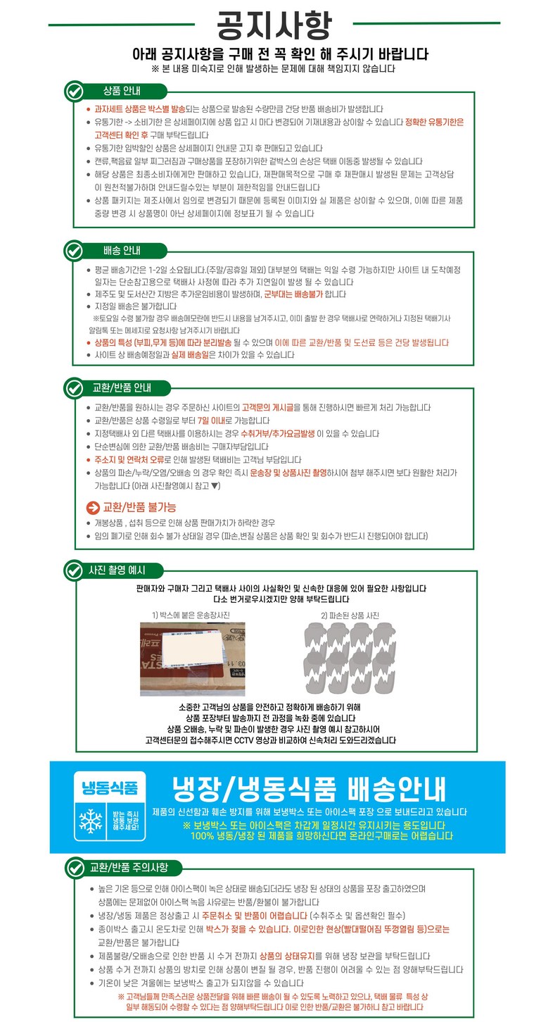 - ㆍ교환/반품에 관한 일반적인 사항은 판매자가 제시사항보다 관계법령이 우선합니다.