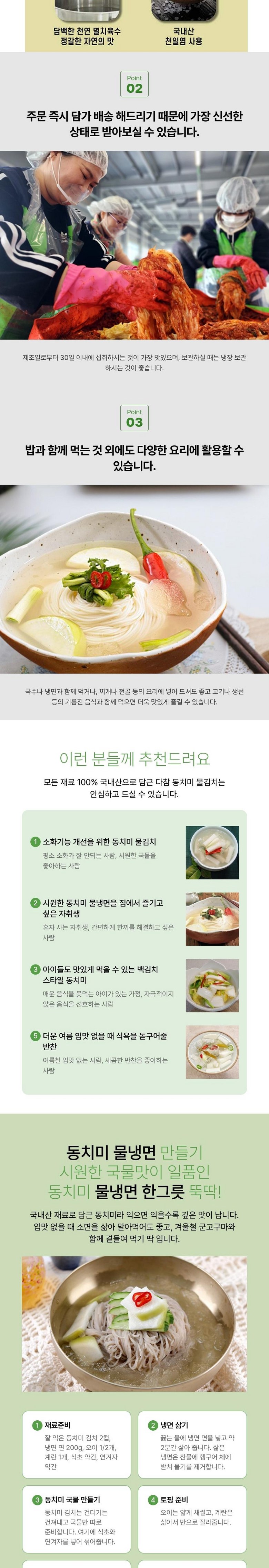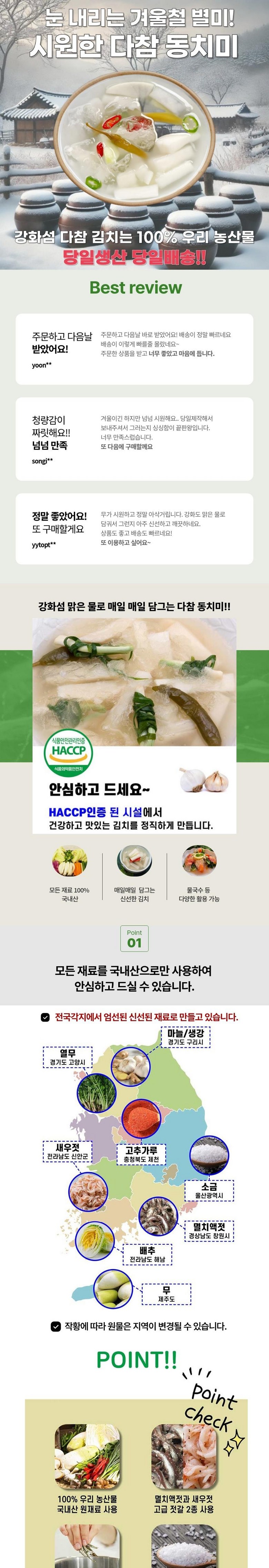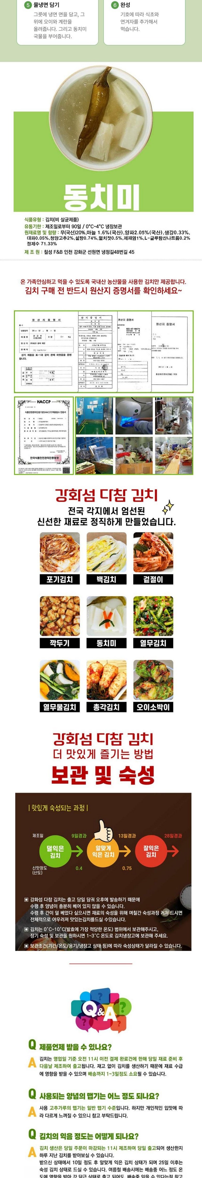 | 품목 또는 명칭 | 모든 재료 국내산 당일생산 강화 다참 동치미 물 김치 | 포장단위별 내용물의 용량(중량),수량,크기 | 1kg, 2kg, 3kg, 5kg |