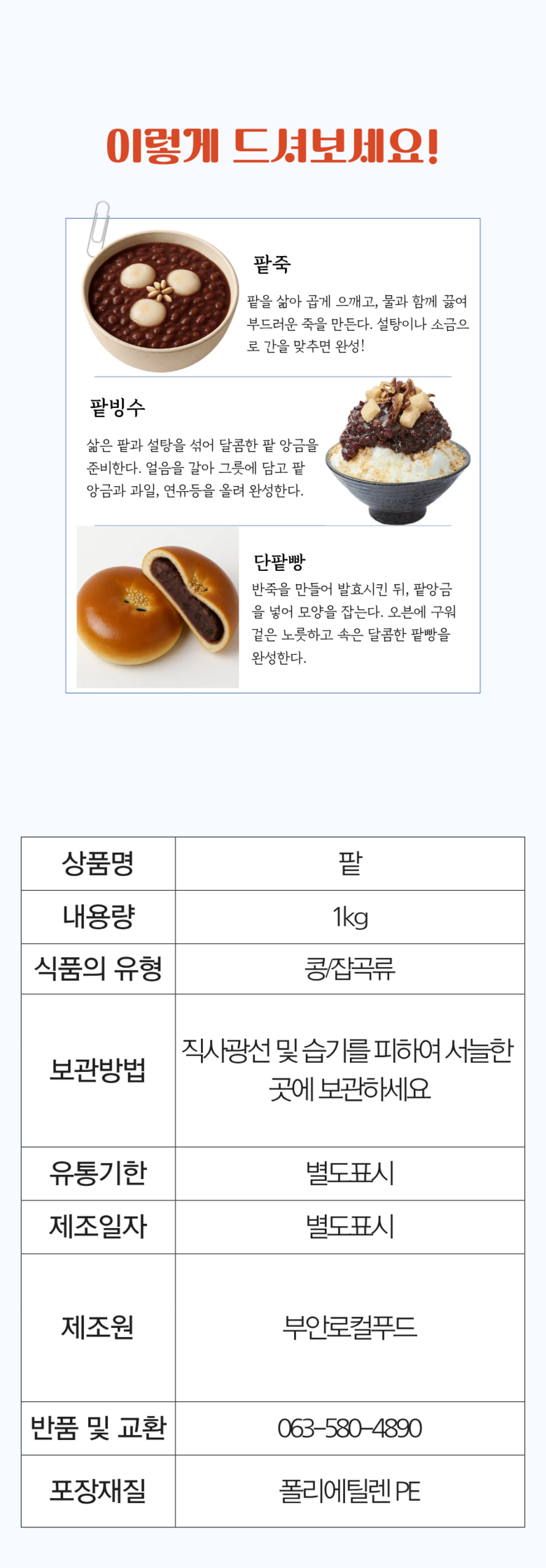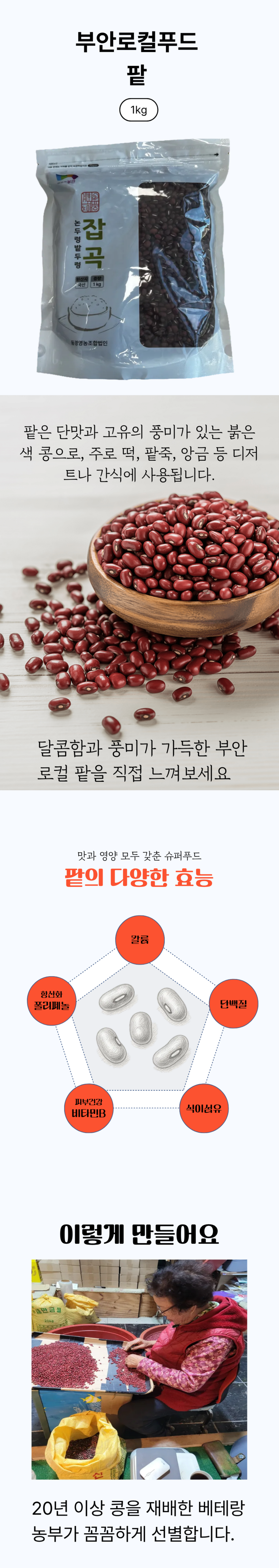 | 품목 또는 명칭 | 부안로컬 팥 | 포장단위별 내용물의 용량(중량),수량,크기 | 1kg |