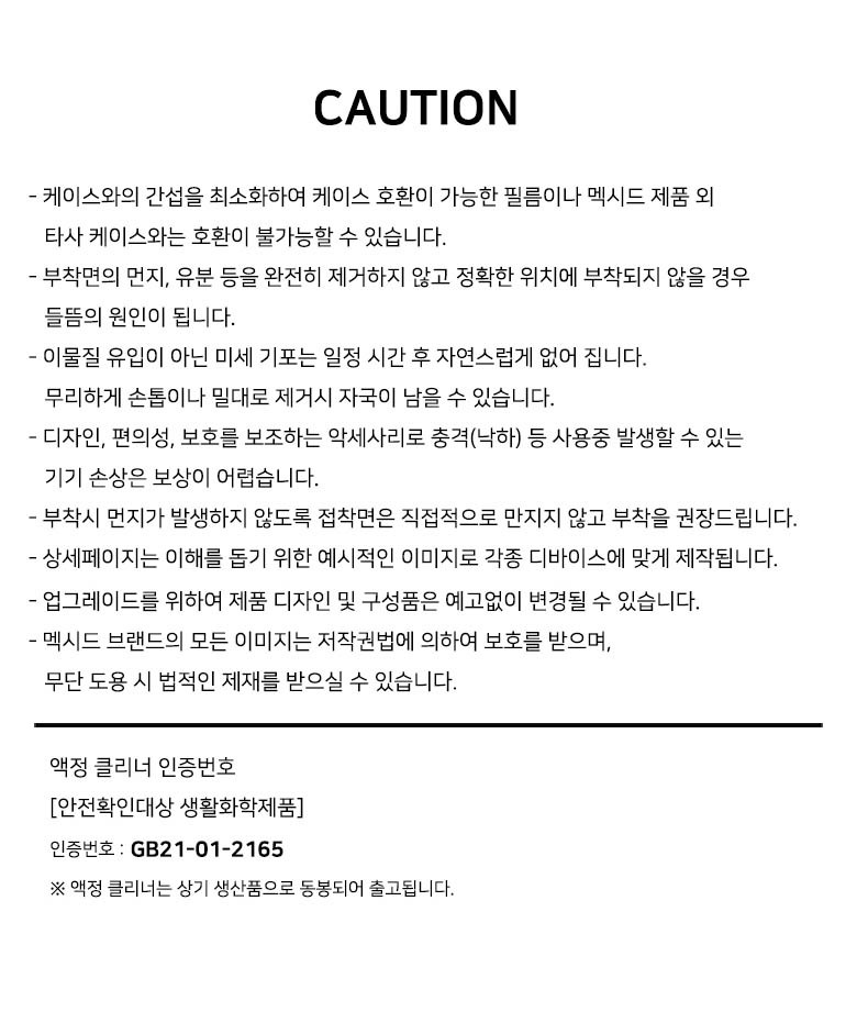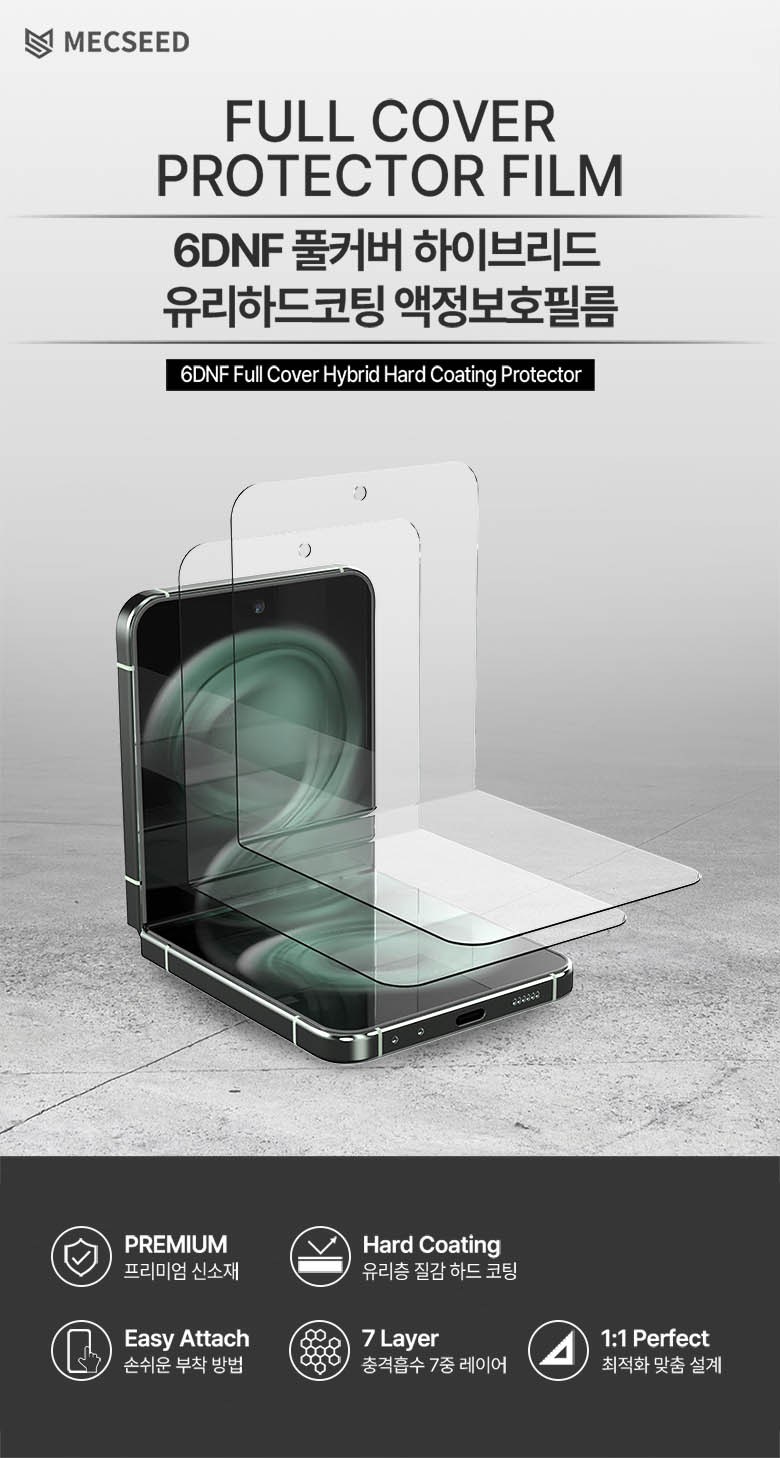 | 품명 및 모델명 | 멕시드 6DNF 풀커버 자가복원 하이브리드 유리하드코팅 강화 휴대폰 액정보호필름, 갤럭시 Z 플립6 / Z플립5, 2매입 | 인증/허가 사항 | 본품 : 해당없음 / 알콜솜 : GB21-01-2165 |