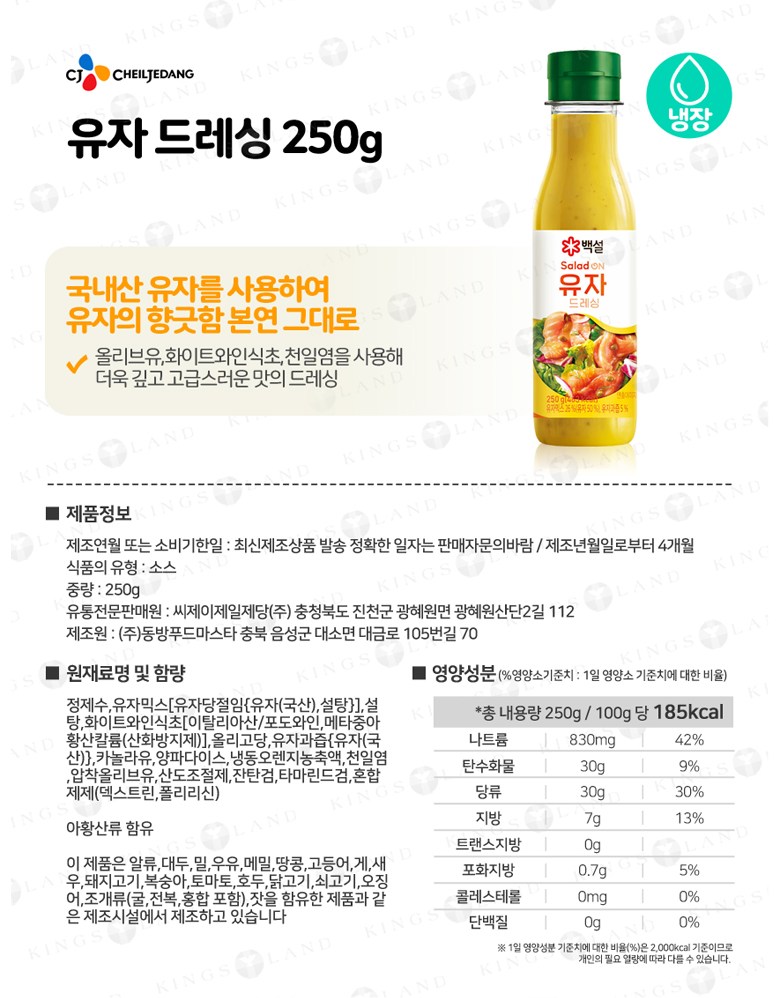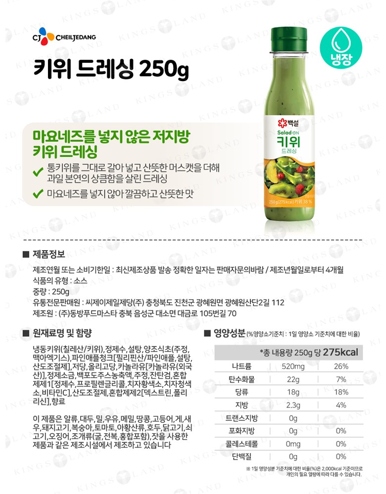 | 배송방법 | 신선/냉장/냉동 | 배송비 | 무료배송 - 도서산간 지역 배송불가 |