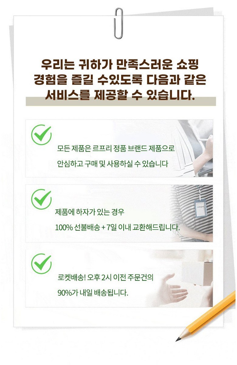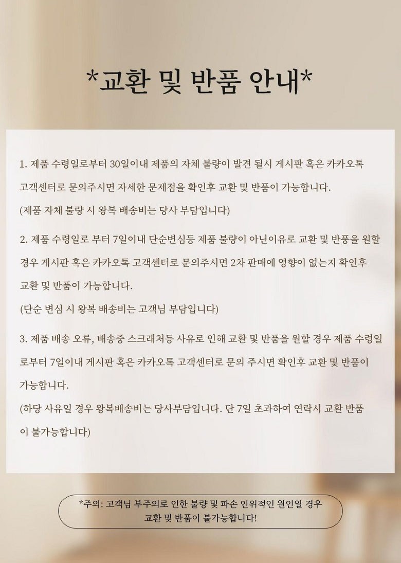 - ㆍ모니터 해상도의 차이로 인해 색상이나 이미지가 실제와 달라, 고객이 단순 변심으로 교환/반품을 무료로 요청하는 경우