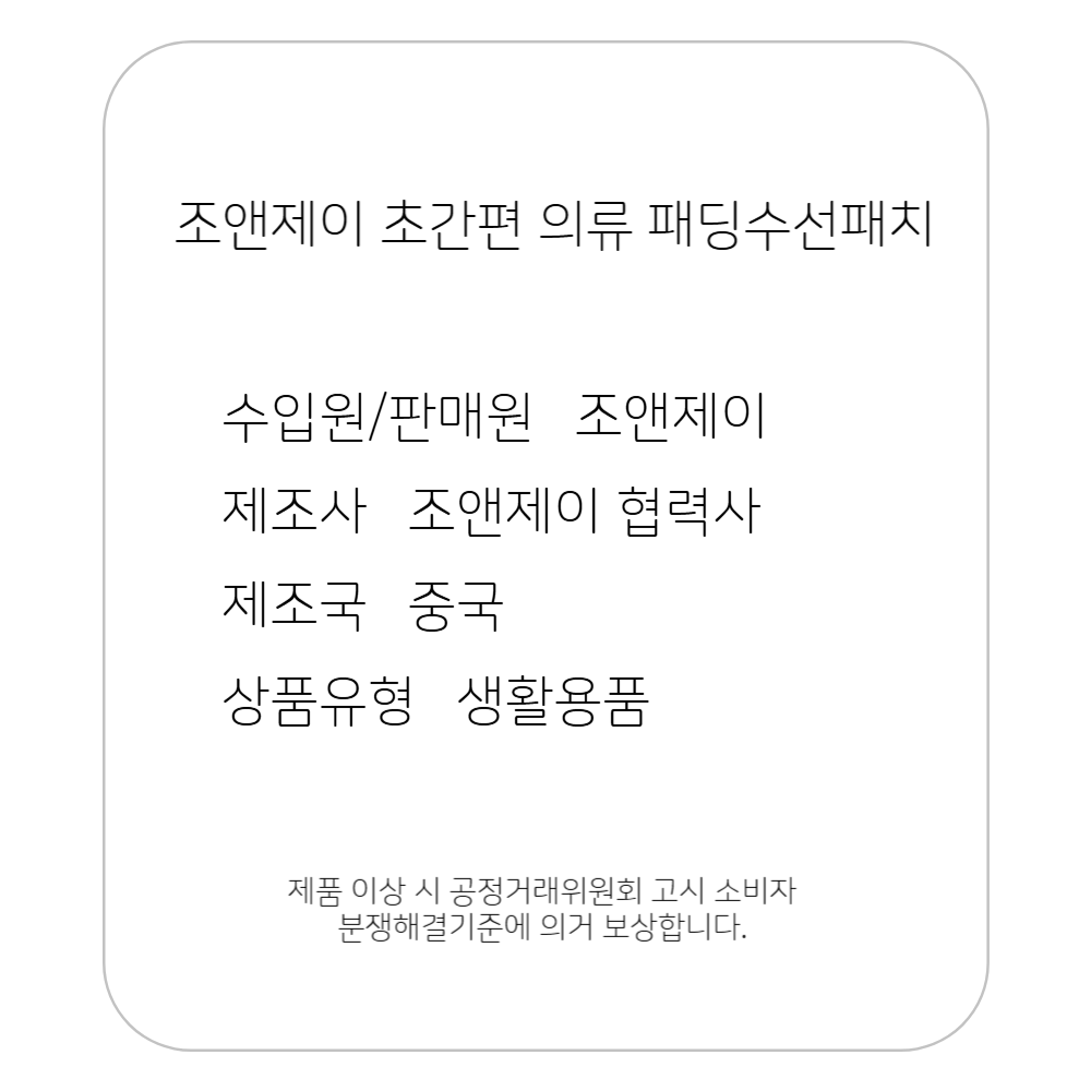 | 제조국(원산지) | 중국 | 제조자(수입자) | 조앤제이 협력업체(정확한 제조자 정보 업체미제공) / 조앤제이 |