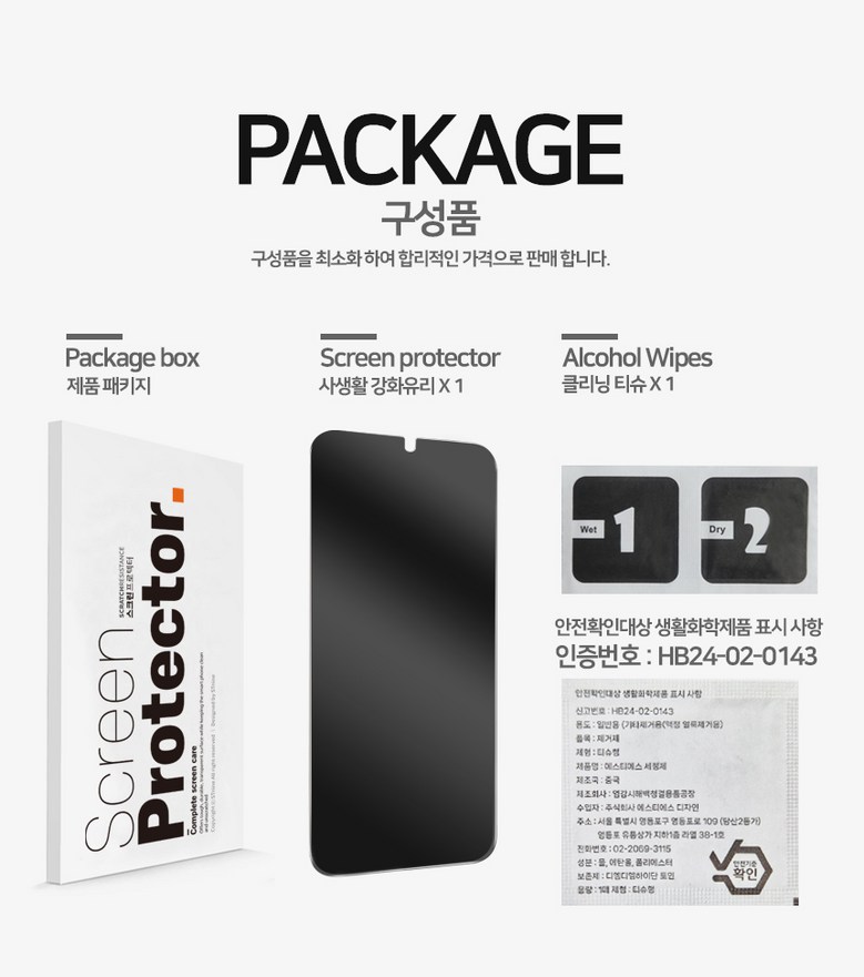 | 품명 및 모델명 | 휴대폰 사생활 강화유리 | 인증/허가 사항 | 생활화학제품 및 살생물제 관련 제품 인증번호 : HB24-02-0143 |