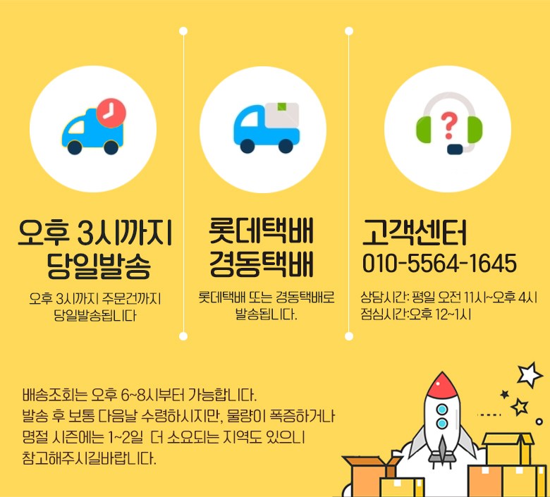 | 배송방법 | 순차배송 | 배송비 | 무료배송 - 도서산간 지역 배송불가 |