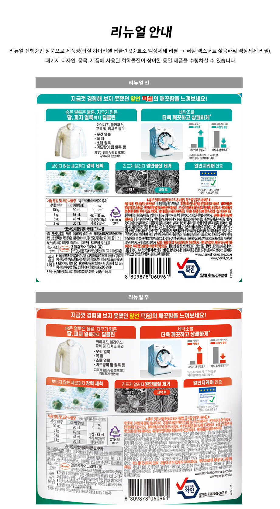 | 품목 및 제품명 | 리뉴얼 전: 세정제,세탁세제 / 퍼실 하이진젤 플러스ㅣ리뉴얼 후: 세정제,세탁세제,탈취제/ 퍼실 엑스퍼트 삶음파워 | 용도(표백제의 경우 계열을 함께표시) 및 제형 | 리뉴얼 전: 세탁세제(섬유용), 세정제(일반용), 기타표면세정용(세탁기내부용) / 액체형ㅣ리뉴얼 후: 세정제-일반용(기타표면세정용(세탁기내부용)), 세탁세제-섬유용, 탈취제-일반용(물체용) / 보충형(액체형) |