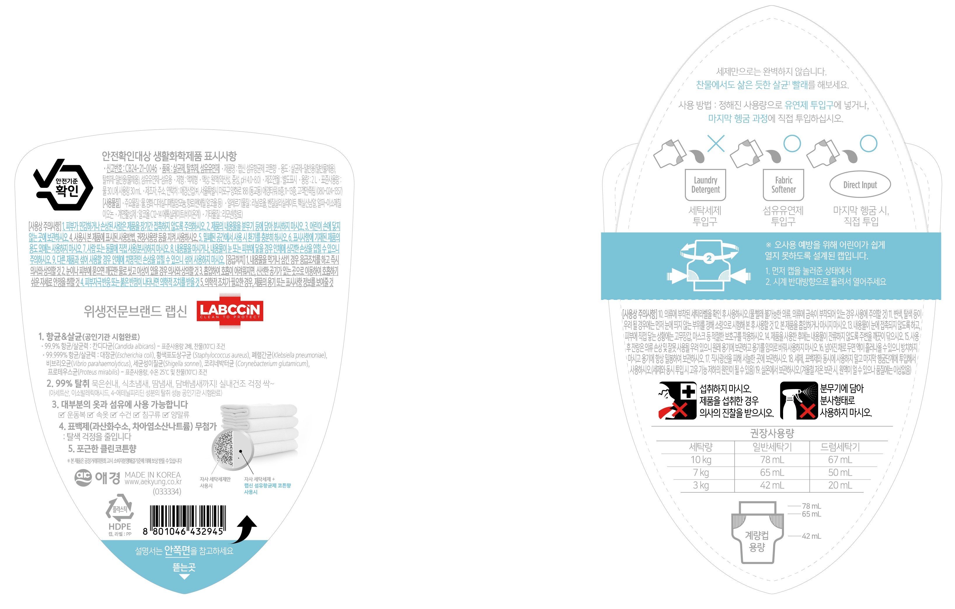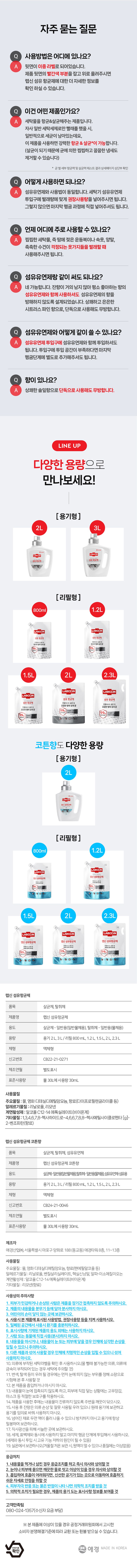 | 품목 및 제품명 | 살균제, 탈취제, 섬유유연제 / 랩신 섬유 향균제 코튼향 | 용도(표백제의 경우 계열을 함께표시) 및 제형 | 살균제 : 일반용(일반물체용), 탈취제 : 일반용(물체용), 섬유유연제 : 섬유용 / 액체형 |