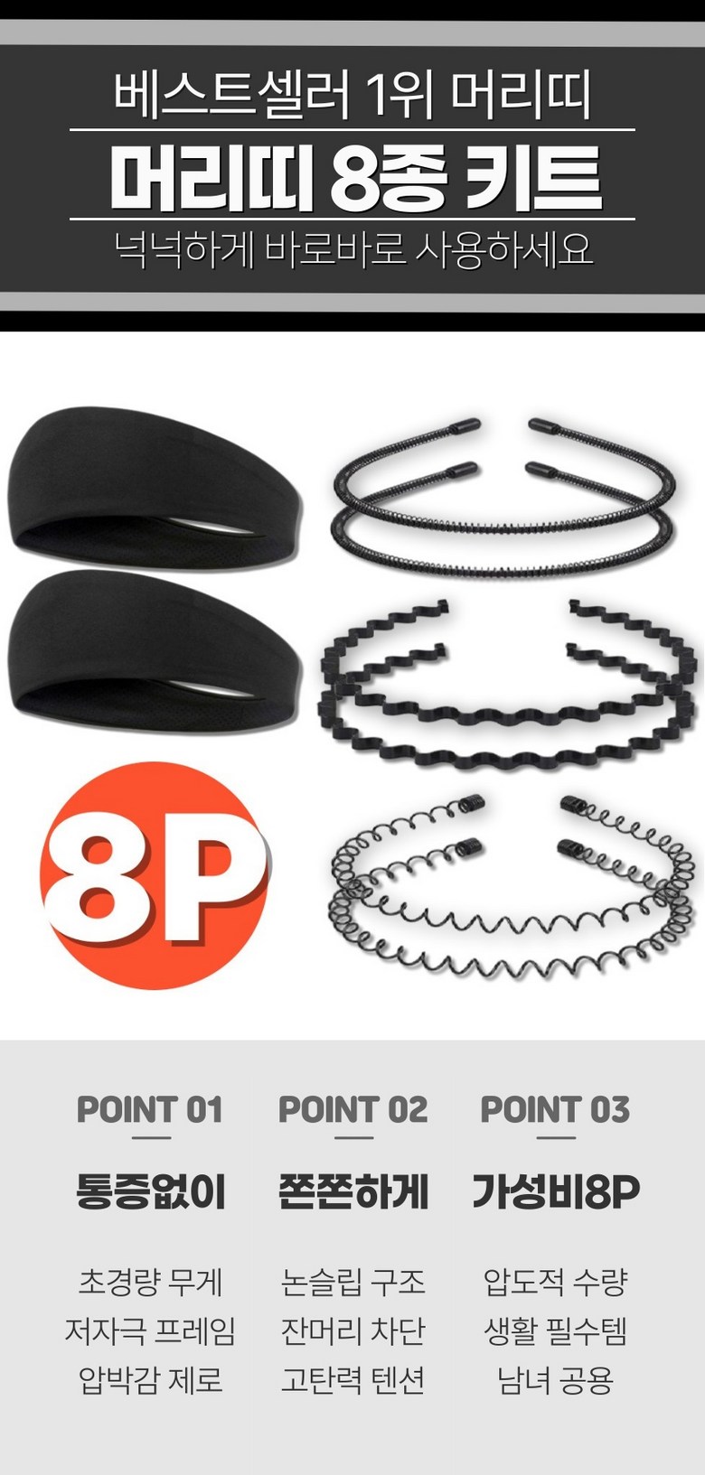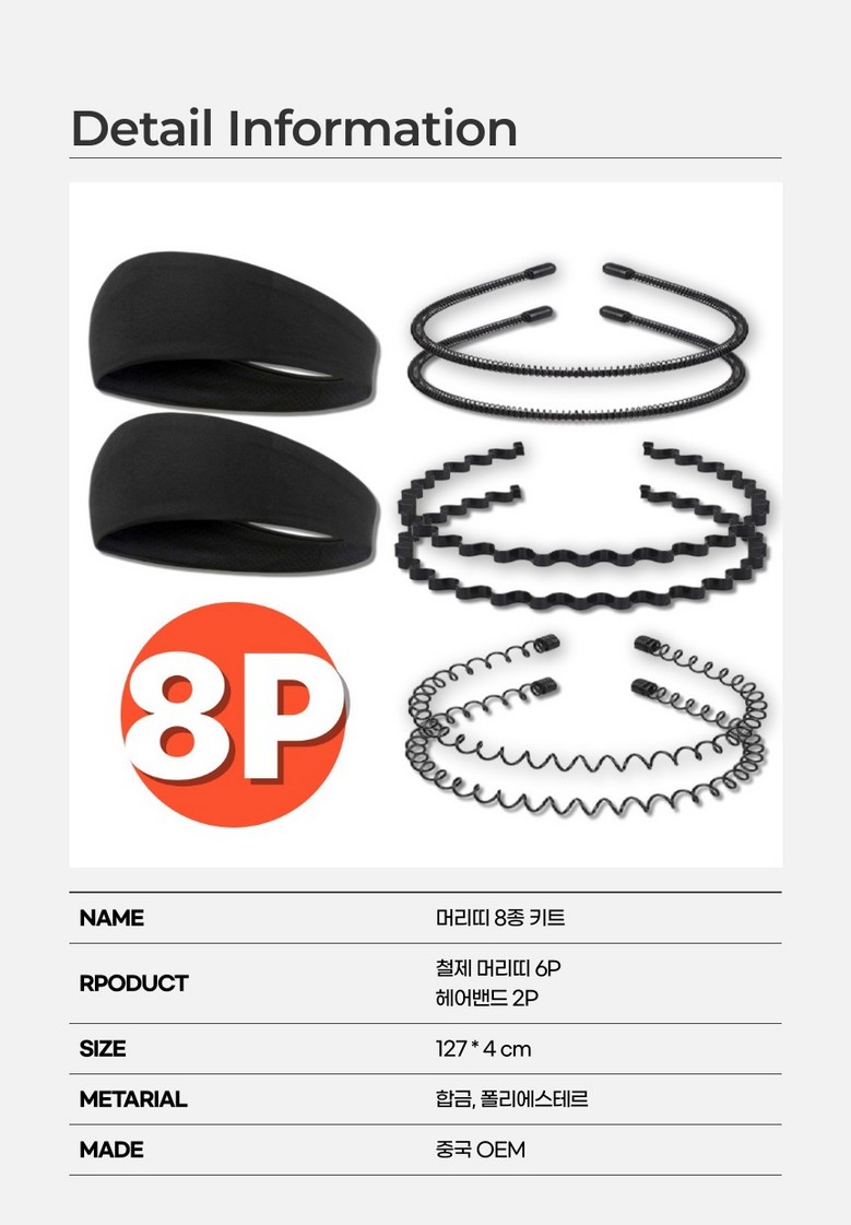 | 품명 및 모델명 | 머리띠 8종 세트 | 인증/허가 사항 | 법에 의한 인증·허가 등을 받았음을 확인할 수 있는 경우 그에 대한 사항 |