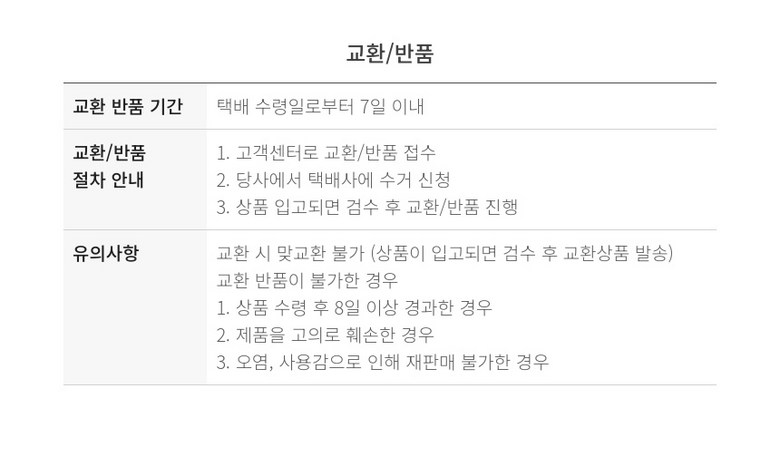 - ㆍ교환/반품에 관한 일반적인 사항은 판매자가 제시사항보다 관계법령이 우선합니다.