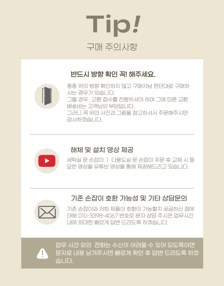 - 상품문의 및 후기게시판을 통해 취소나 환불, 반품 등은 처리되지 않습니다.