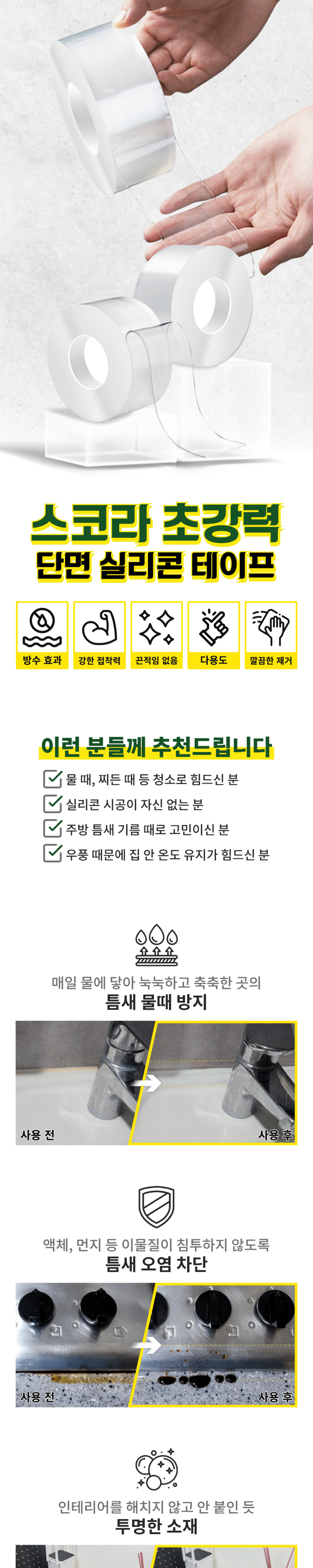 | 품명 및 모델명 | 초강력 실리콘 단면 테이프 틈새차단 방수 | 인증/허가 사항 | 해당 사항 없음 |