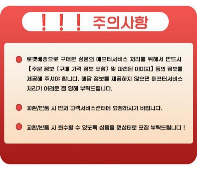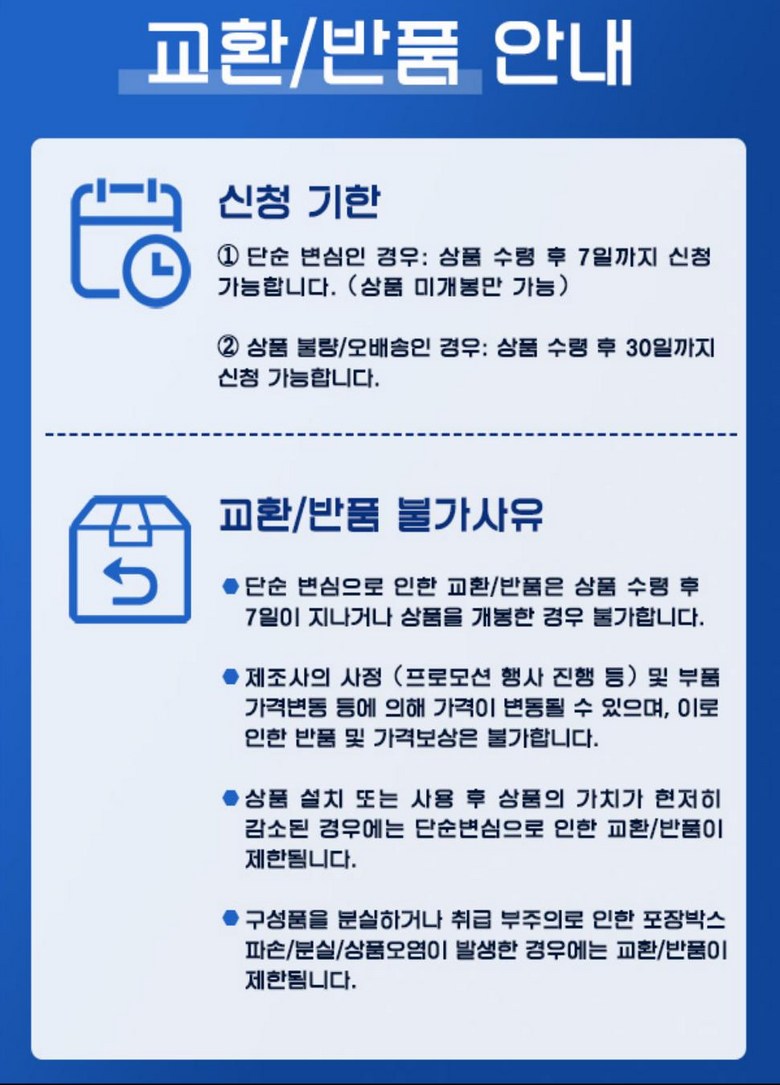 - ㆍ교환/반품에 관한 일반적인 사항은 판매자가 제시사항보다 관계법령이 우선합니다.