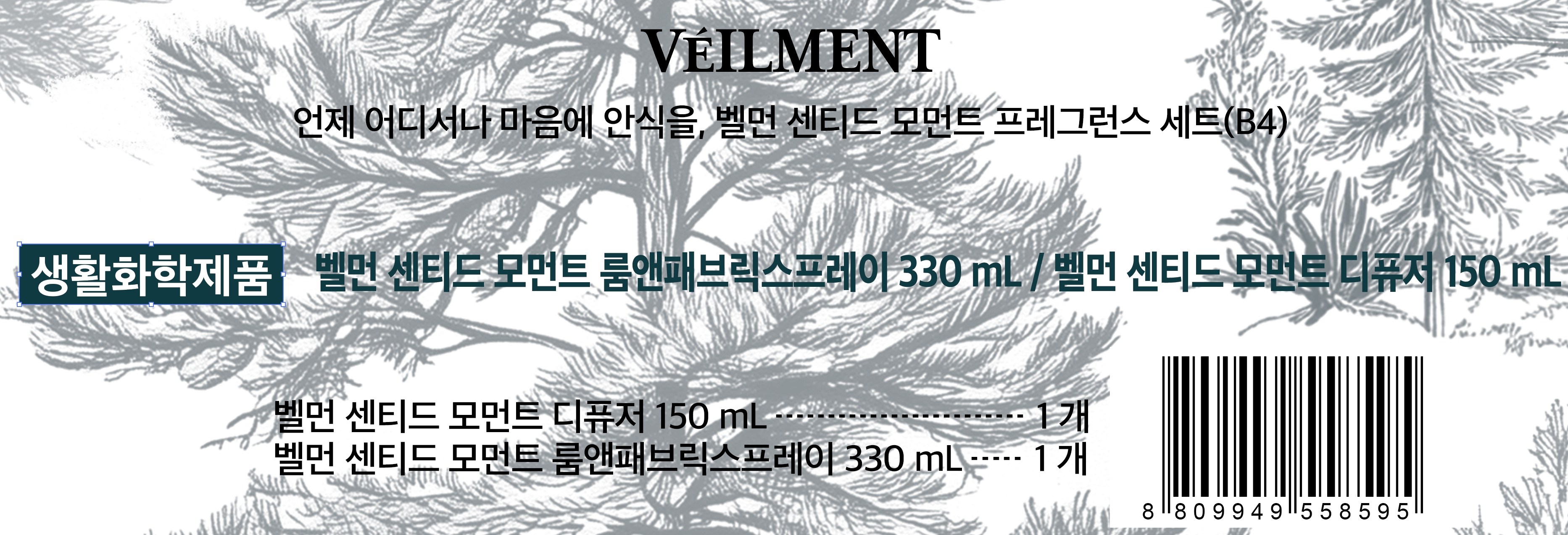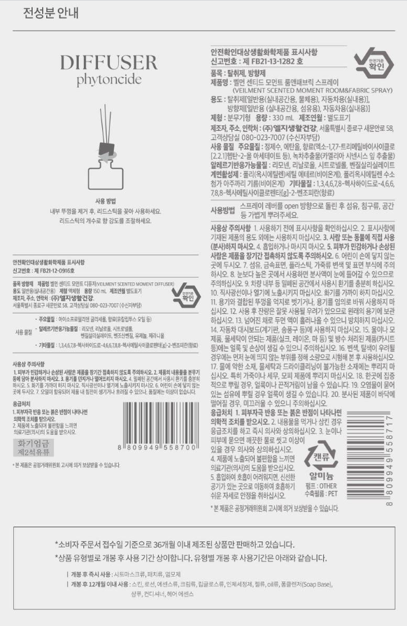 | 품목 및 제품명 | 방향제 / 벨먼 센티드 모먼트 디퓨저 (VEILMENT SCENTED MOMENT DIFFUSER), 벨먼 센티드 모먼트 룸앤패브릭 스프레이 (VEILMENT SCENTED MOMENT ROOM&FABRIC SPRAY) | 용도(표백제의 경우 계열을 함께표시) 및 제형 | 디퓨져 : 일반용(실내공간용) / 액체형, 스프레이 : 탈취제[일반용(실내공간용, 물체용), 자동차용(실내용)], 방향제[일반용 (실내공간용, 섬유용), 자동차용(실내용)] / 분무기형 |