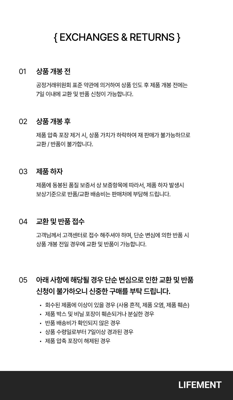 - ㆍ교환/반품에 관한 일반적인 사항은 판매자가 제시사항보다 관계법령이 우선합니다.