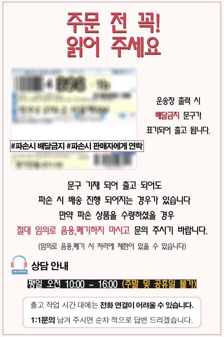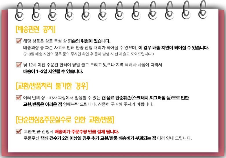 - ㆍ모니터 해상도의 차이로 인해 색상이나 이미지가 실제와 달라, 고객이 단순 변심으로 교환/반품을 무료로 요청하는 경우