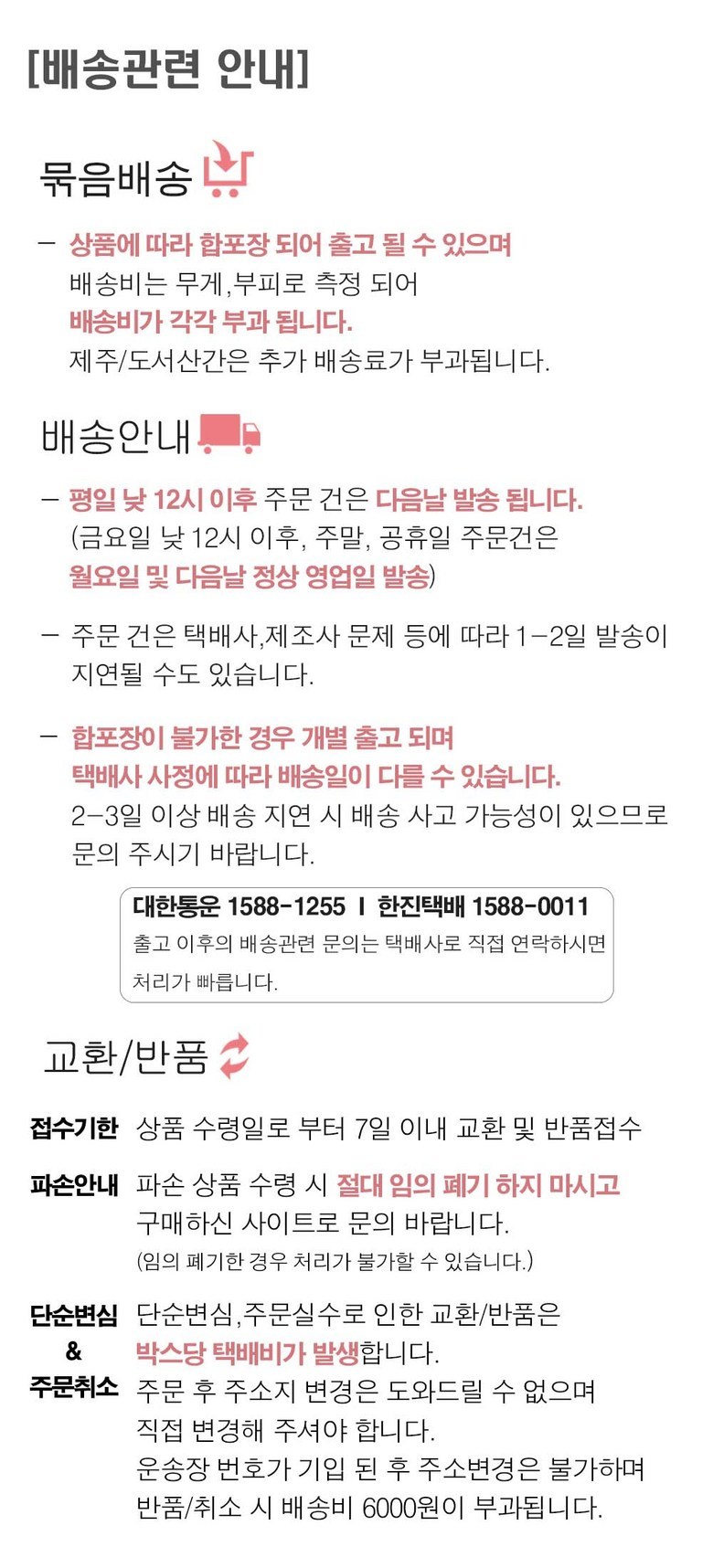 - ㆍ교환/반품에 관한 일반적인 사항은 판매자가 제시사항보다 관계법령이 우선합니다.