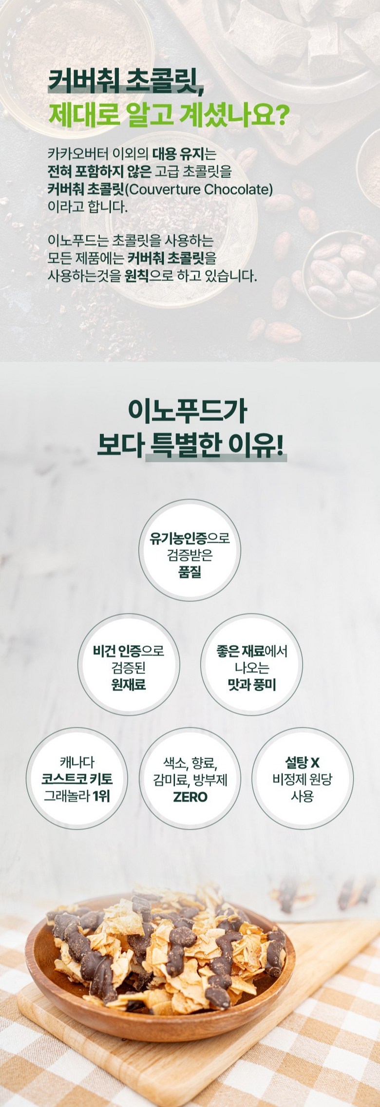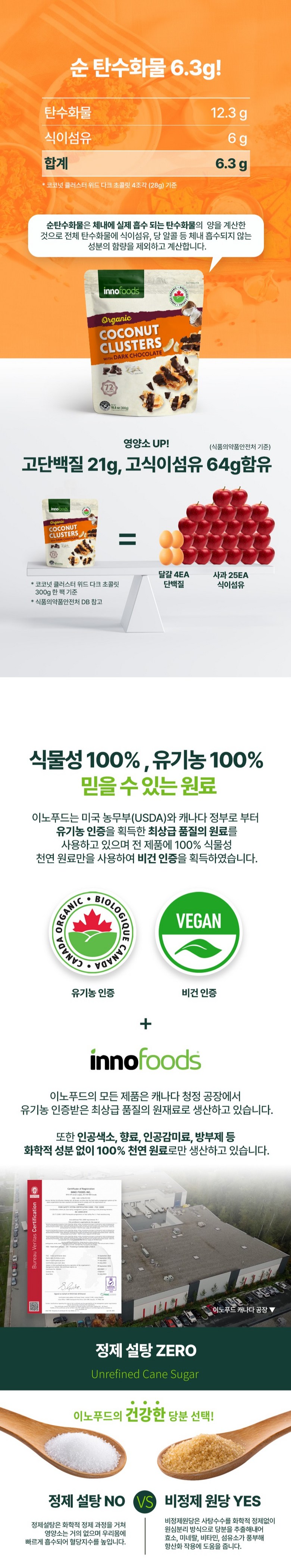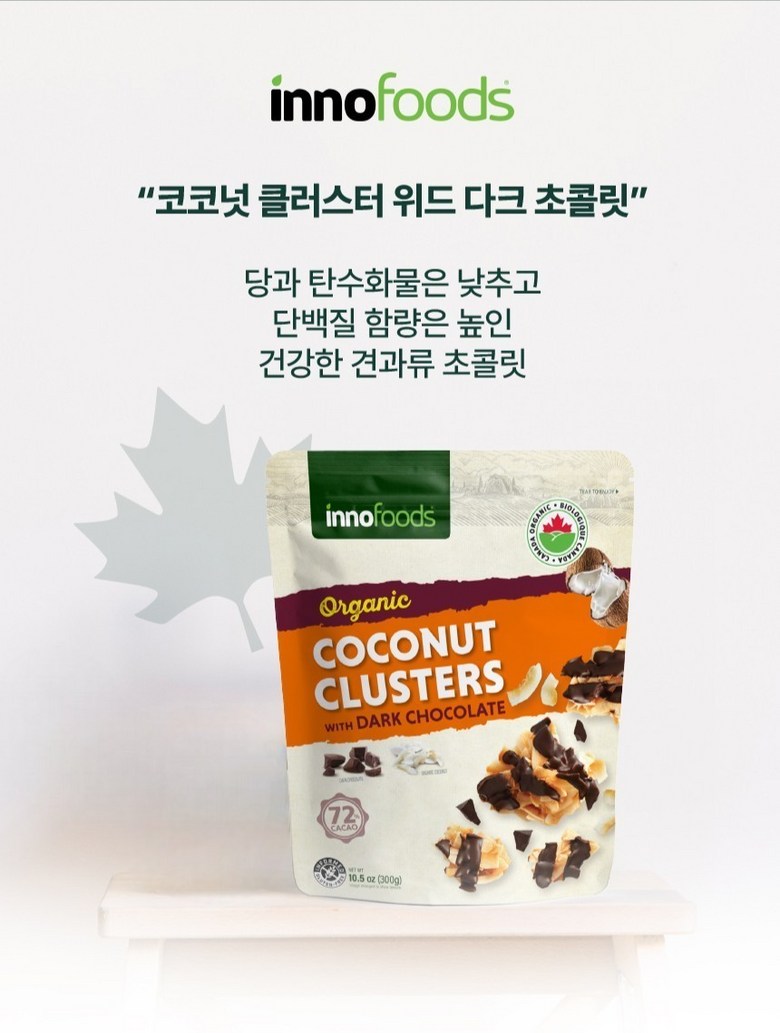 | 품목 또는 명칭 | 유기농 코코넛클러스터 위드 다크초콜릿 | 포장단위별 내용물의 용량(중량),수량,크기 | 300g 1개 |