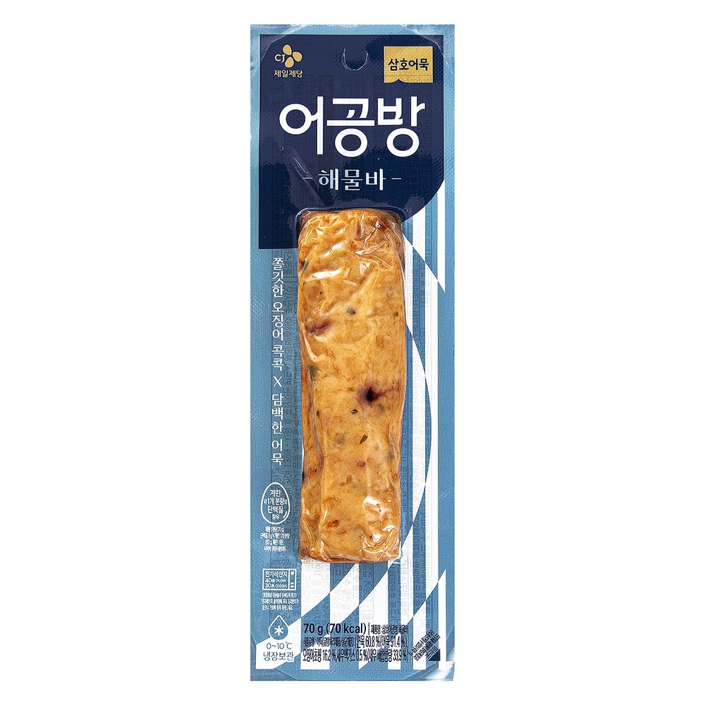 전자레인지로 조리하는 해물바예요. 대파와 청양고추를 썰어 넣어, 느끼하지 않고 담백한 맛이 특징이죠. 반죽에 콕콕 박힌 오징어초핑이 쫄깃한 식감과 고소한 맛을 더해준답니다. 씹으면 씹을수록 달착지근하고 짭조름한 맛이 새어 나와, 간식이나 안주로 제격이에요.