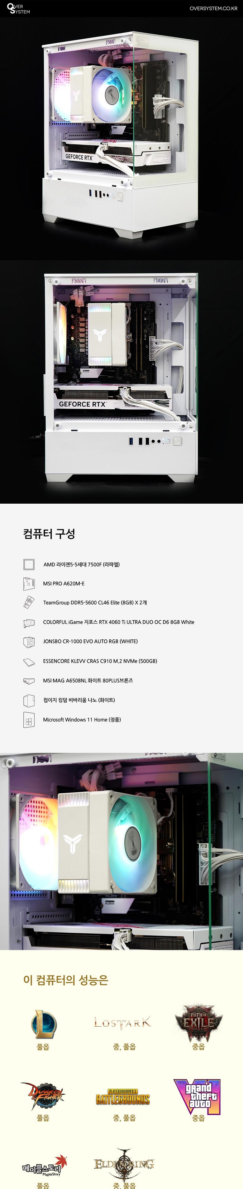 오버시스템 게이밍PC 조립컴퓨터 라이젠 7500F 16GB 지포스 RTX 4060 Ti 500GB SSD 윈도우 정품 롤 로스트아크 배그 발로란트 오버워치