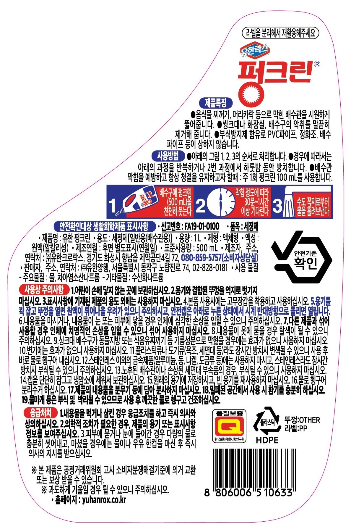 | 품목 및 제품명 | 세정제 / 유한 펑크린 | 용도(표백제의 경우 계열을 함께표시) 및 제형 | 세정제 - 일반용(배수관용) / 액체형 |