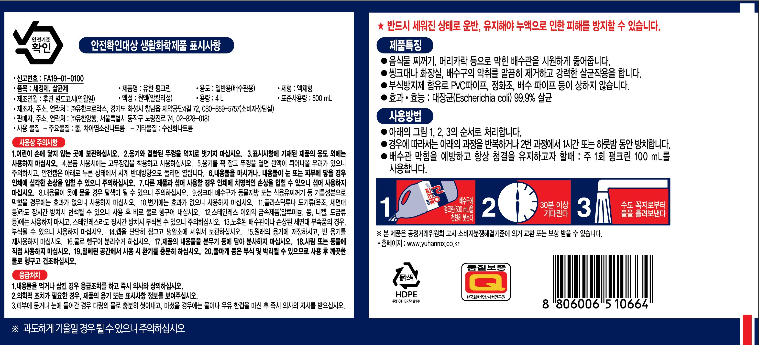 | 품목 및 제품명 | 세정제,살균제/유한 펑크린 | 용도(표백제의 경우 계열을 함께표시) 및 제형 | 일반용(배수관용) / 액체형 |