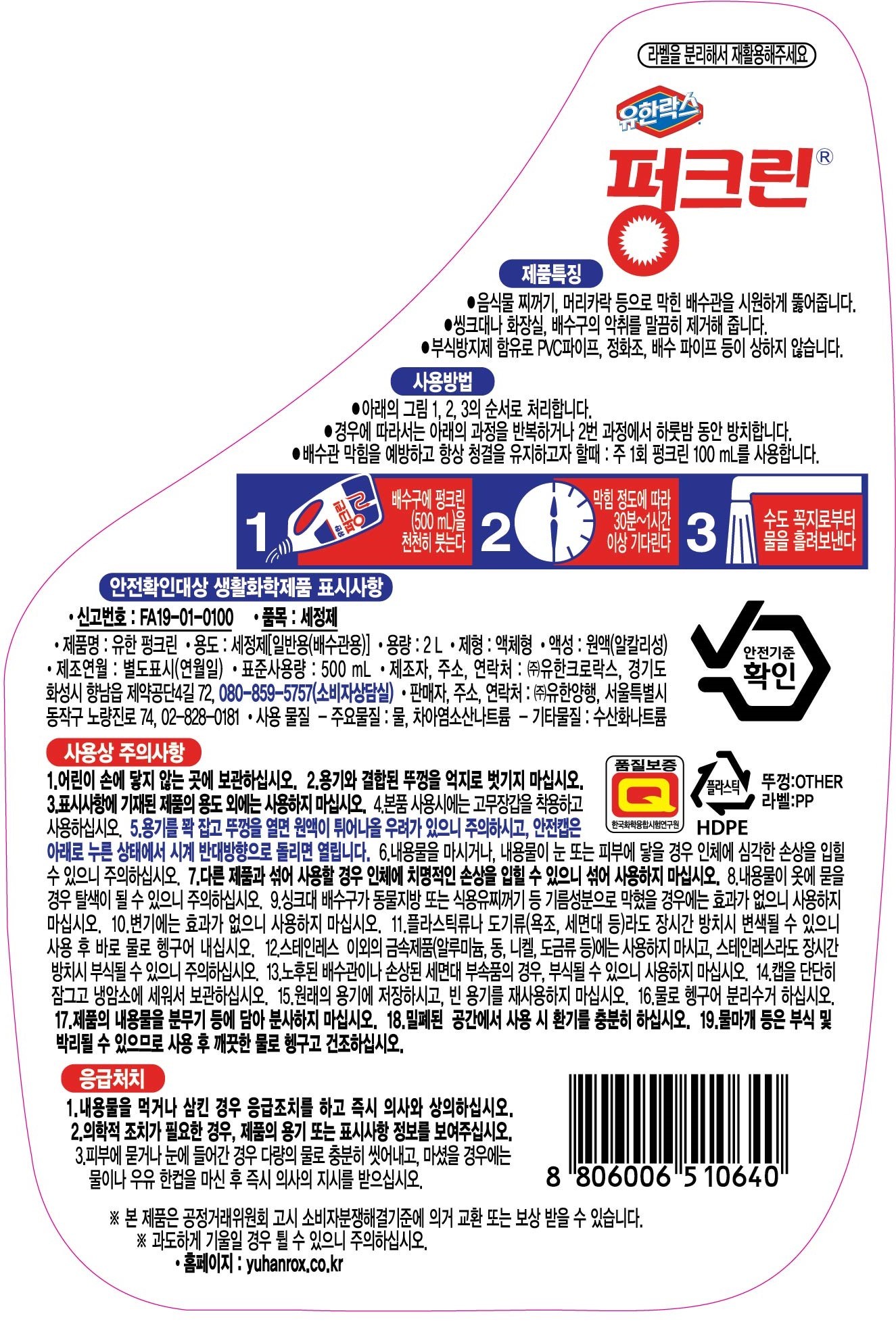 | 품목 및 제품명 | 세정제,살균제/유한 펑크린 | 용도(표백제의 경우 계열을 함께표시) 및 제형 | 일반용-배수관용/비분사형-액체형 |