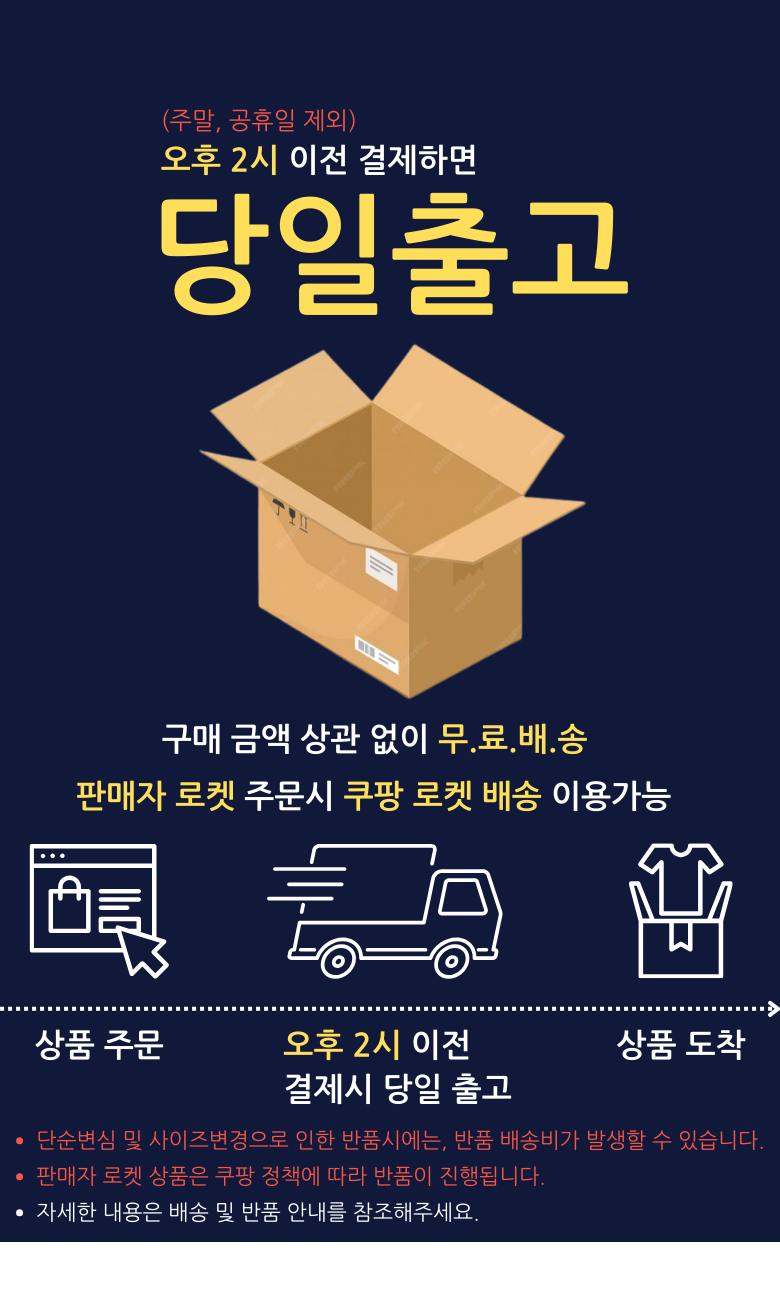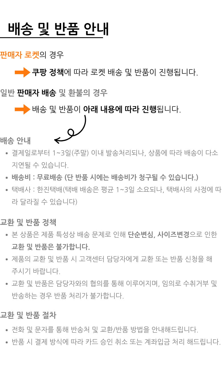 - ㆍ모니터 해상도의 차이로 인해 색상이나 이미지가 실제와 달라, 고객이 단순 변심으로 교환/반품을 무료로 요청하는 경우