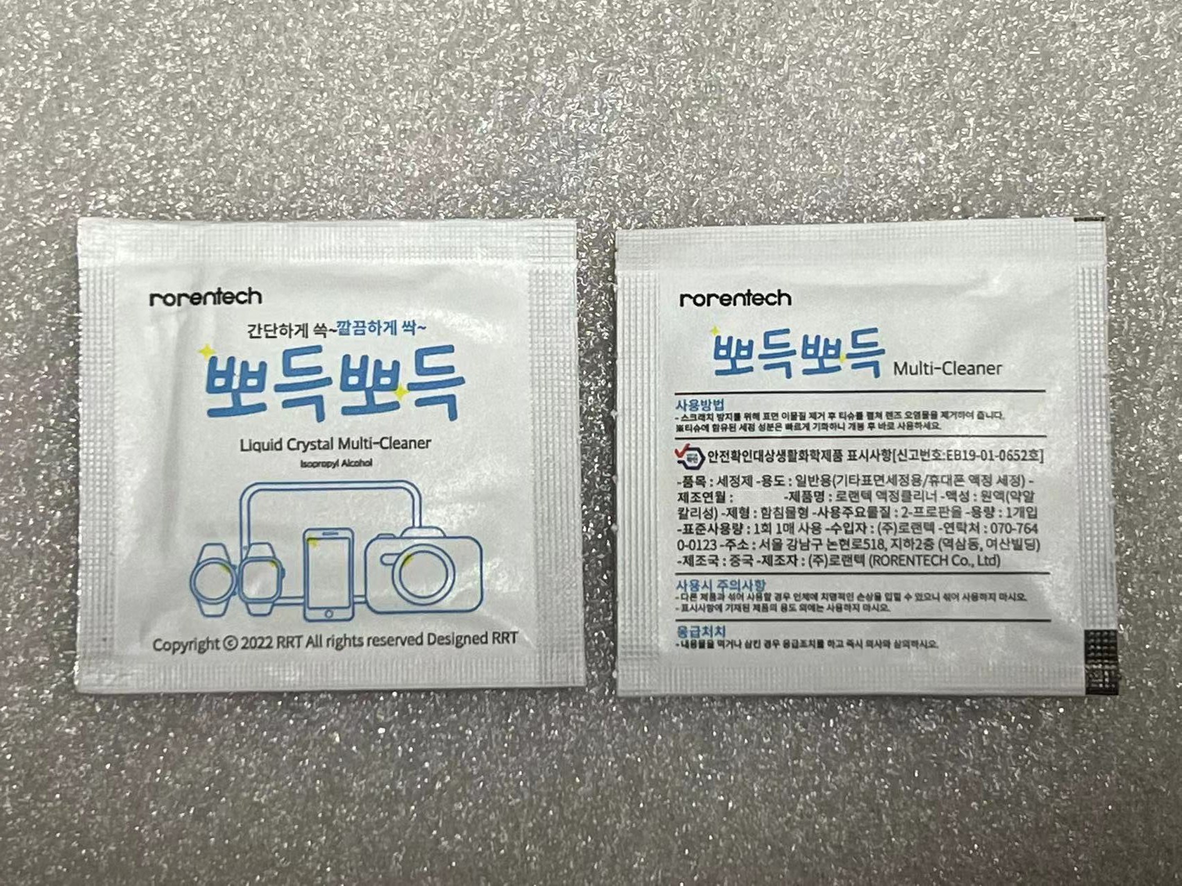 | 제조국(원산지) | 본품 : 중국 / 알콜솜 : 컨텐츠참조 | 제조자(수입자) | 본품 : RORENTECH CO., LTD./업체미제공 / 알콜솜 : 컨텐츠참조 |