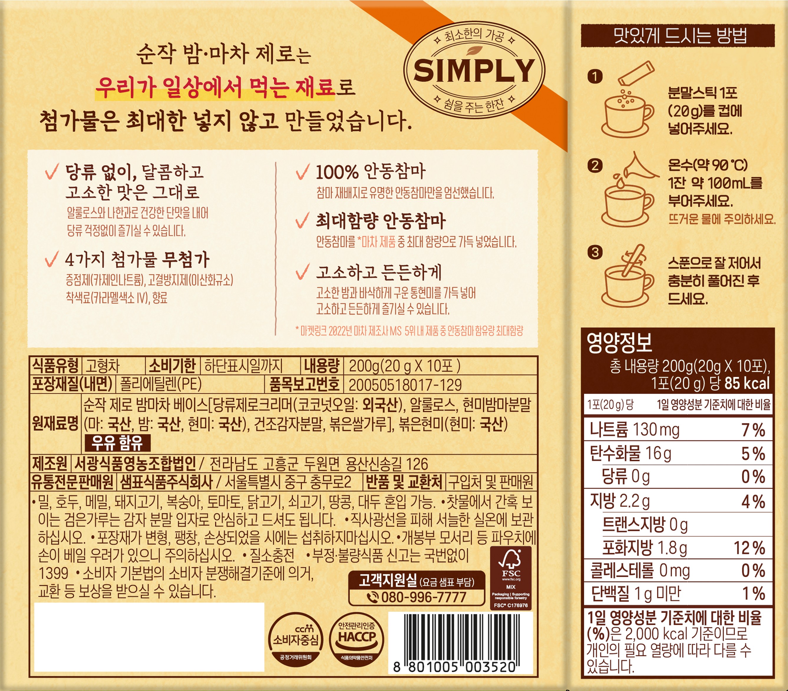 | 제품명 | 통현미 가득 밤·마차 제로 | 식품의 유형 | 컨텐츠 참조 |