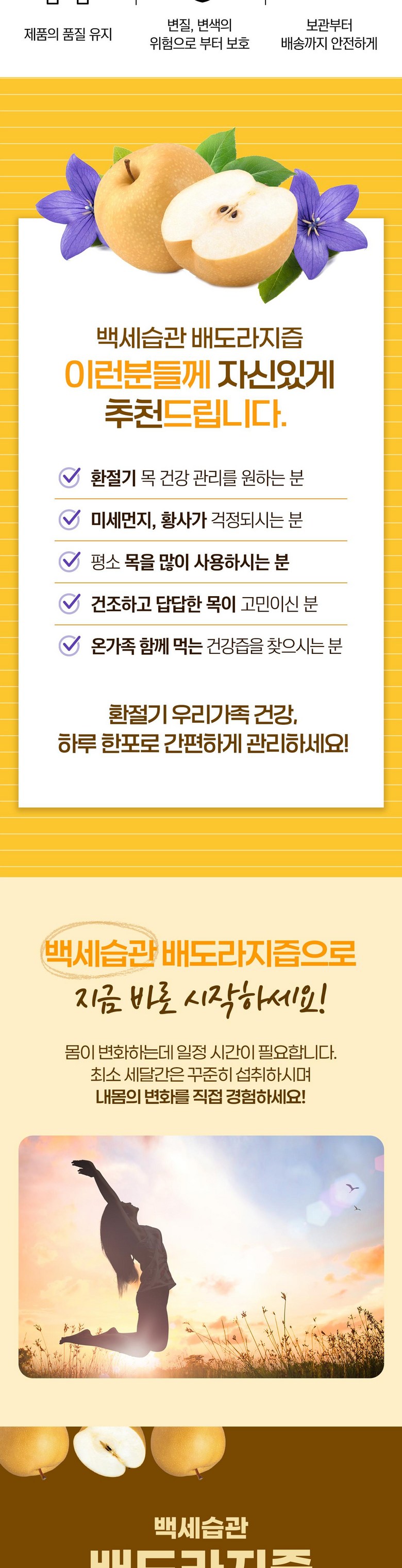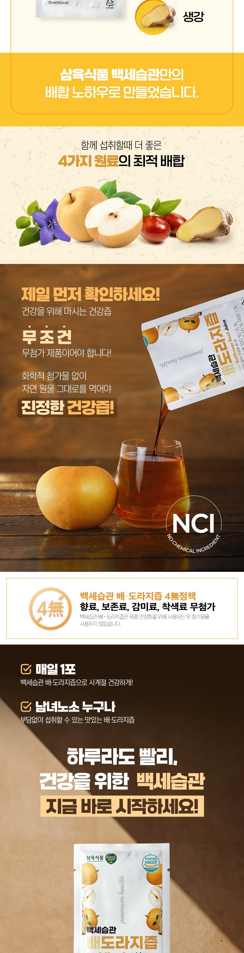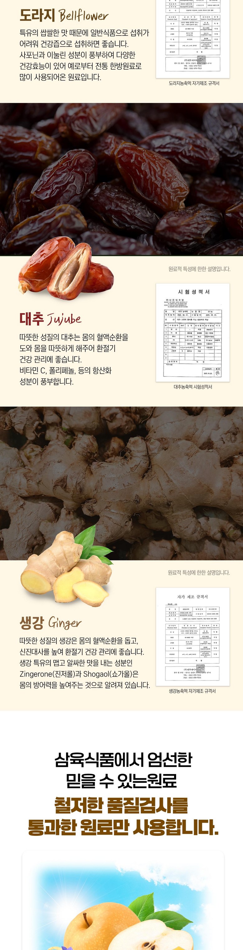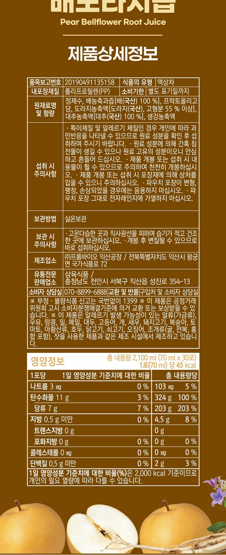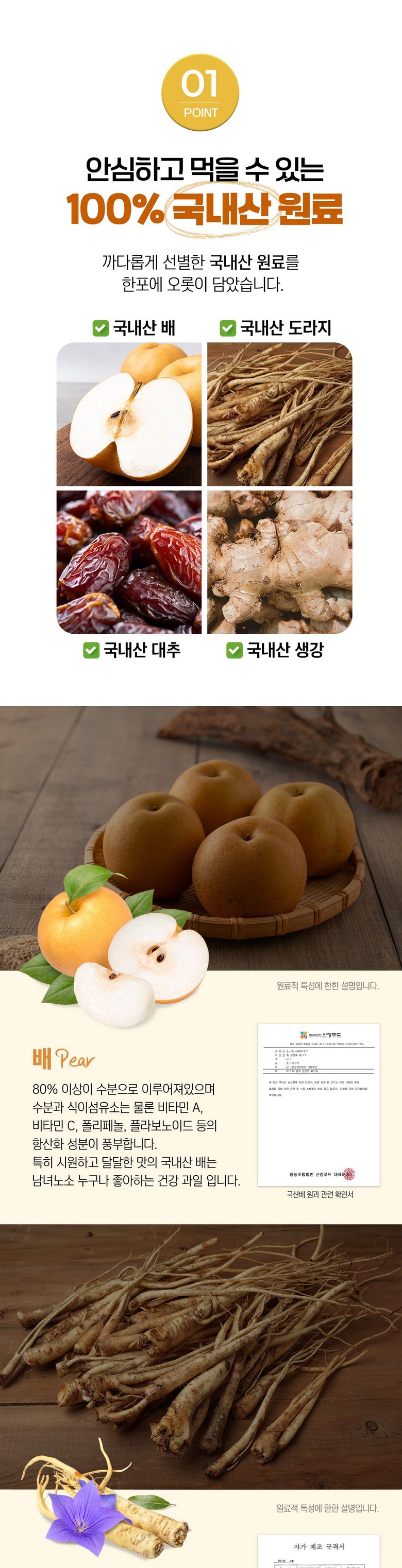 | 포장단위별 내용물의 용량(중량), 수량 | 70ml x 30포 (1박스기준) | 원재료명 및 함량 | 정제수, 배농축과즙 [배(국산) 100%], 프락토올리고당, 도라지농축액[도라지(국산)], 고형분 55% 이상], 대추농축액[대추(국산) 100%], 생강농축액 |