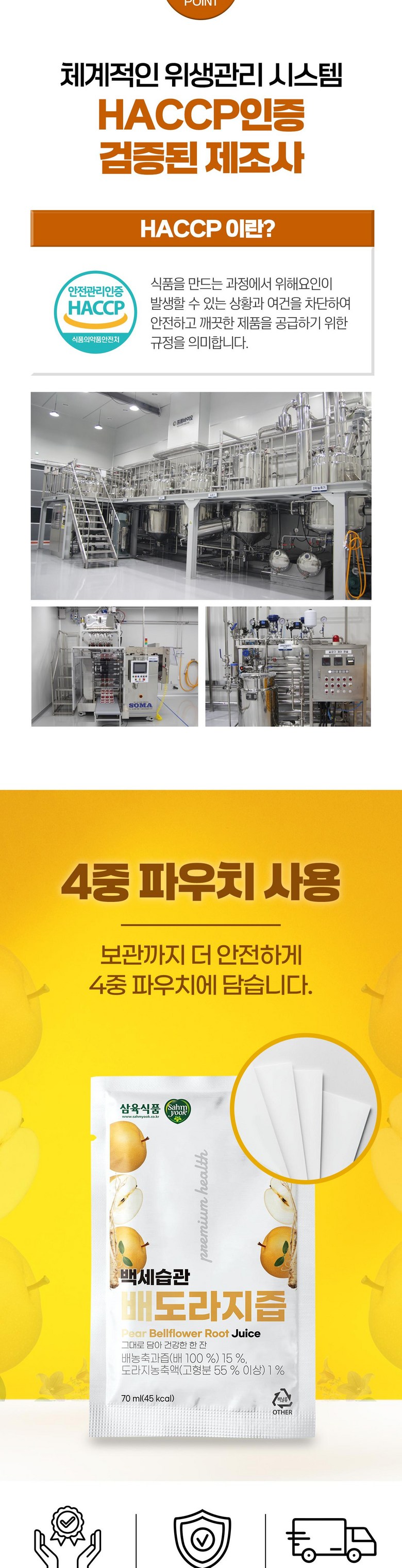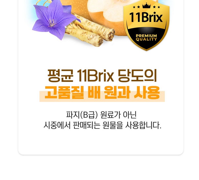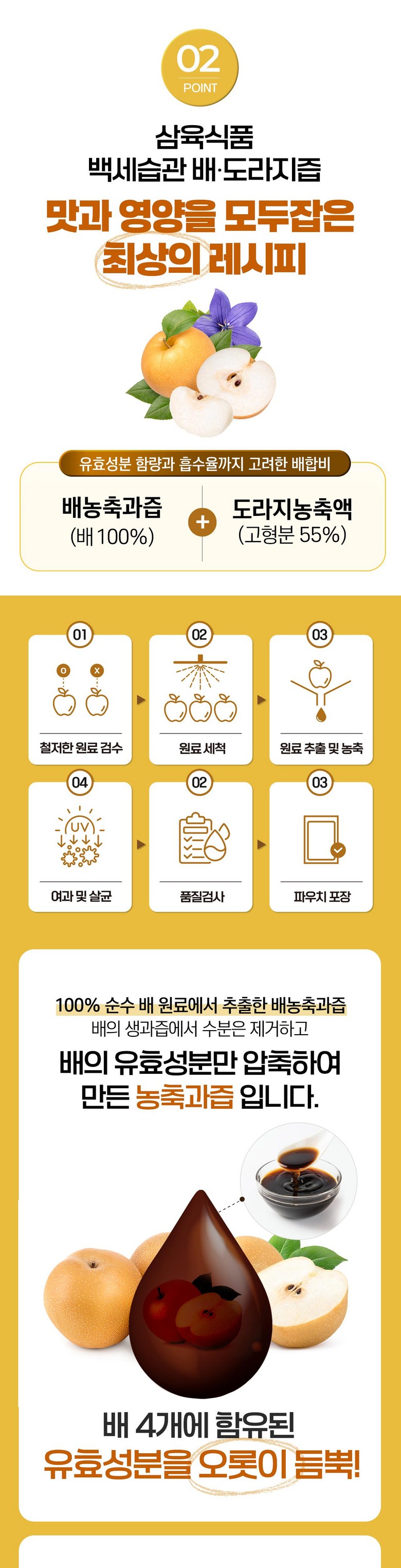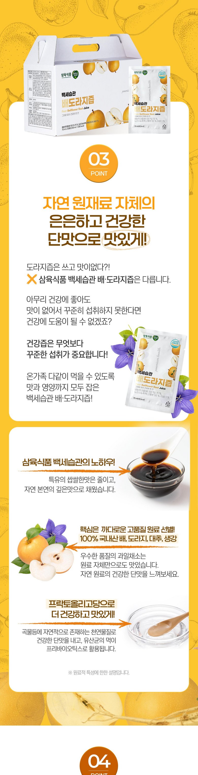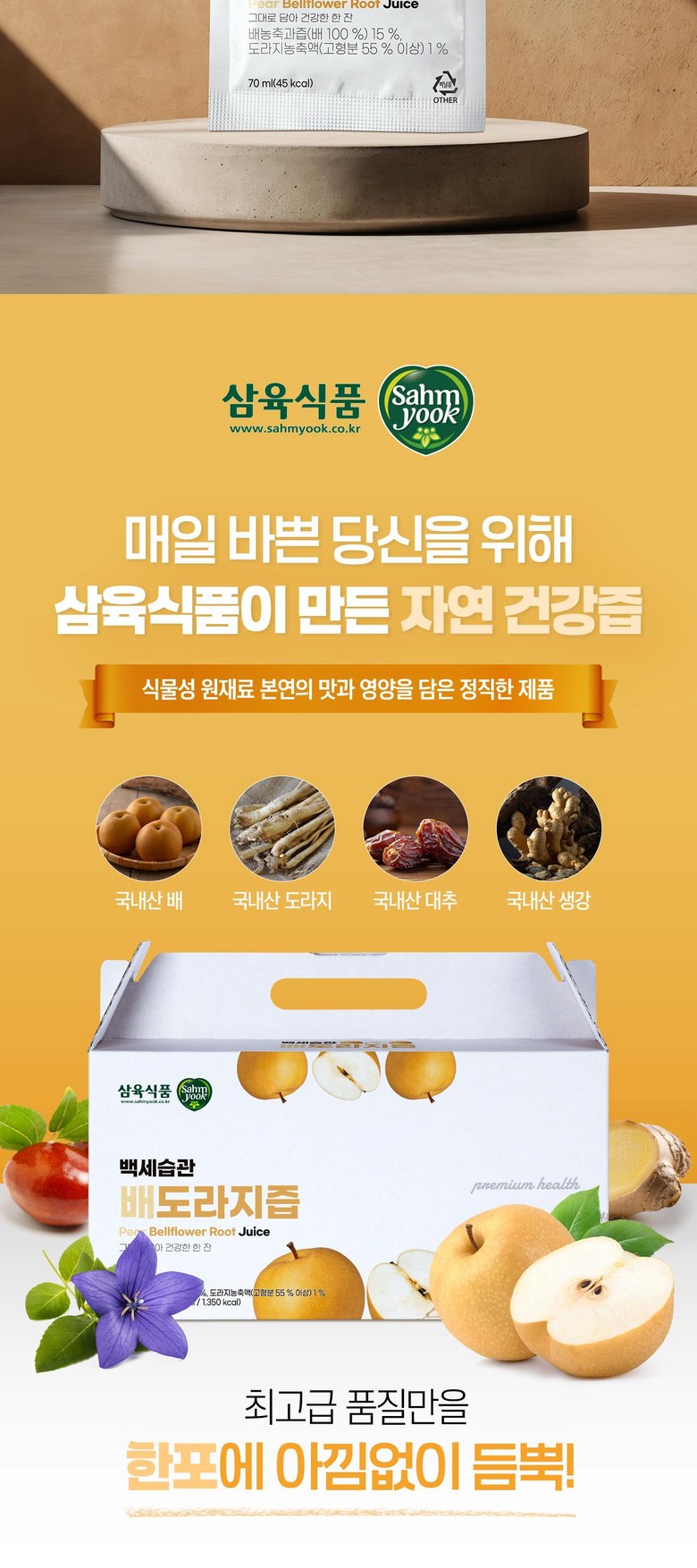 | 포장단위별 내용물의 용량(중량), 수량 | 70ml x 30포 (1박스기준) | 원재료명 및 함량 | 정제수, 배농축과즙 [배(국산) 100%], 프락토올리고당, 도라지농축액[도라지(국산)], 고형분 55% 이상], 대추농축액[대추(국산) 100%], 생강농축액 |