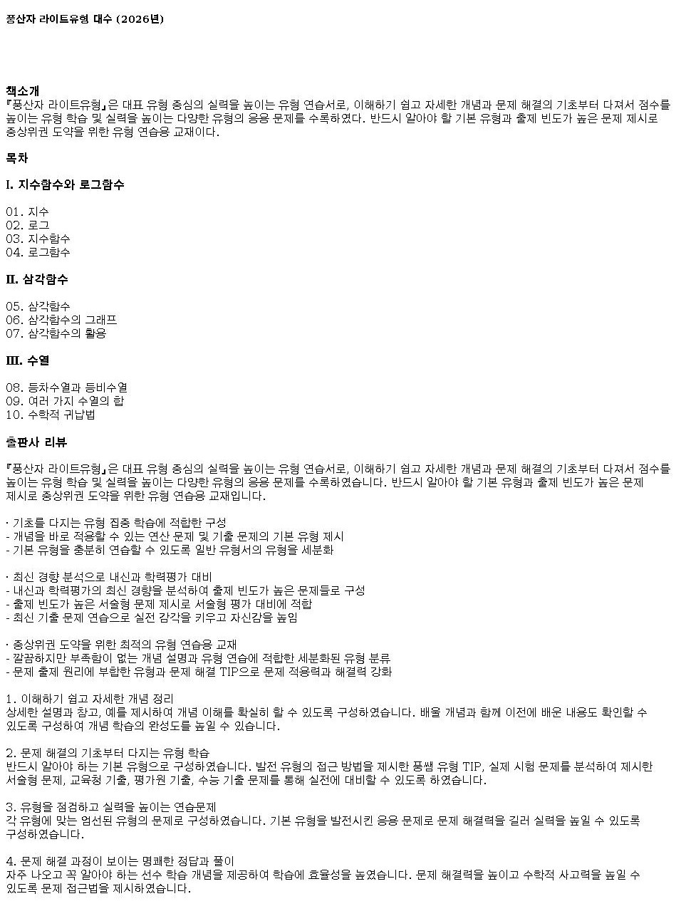 | 도서명 | 풍산자 라이트유형 대수 (2026년) | 저자, 출판사 | 풍산자수학연구소 / 지학사(학습) |