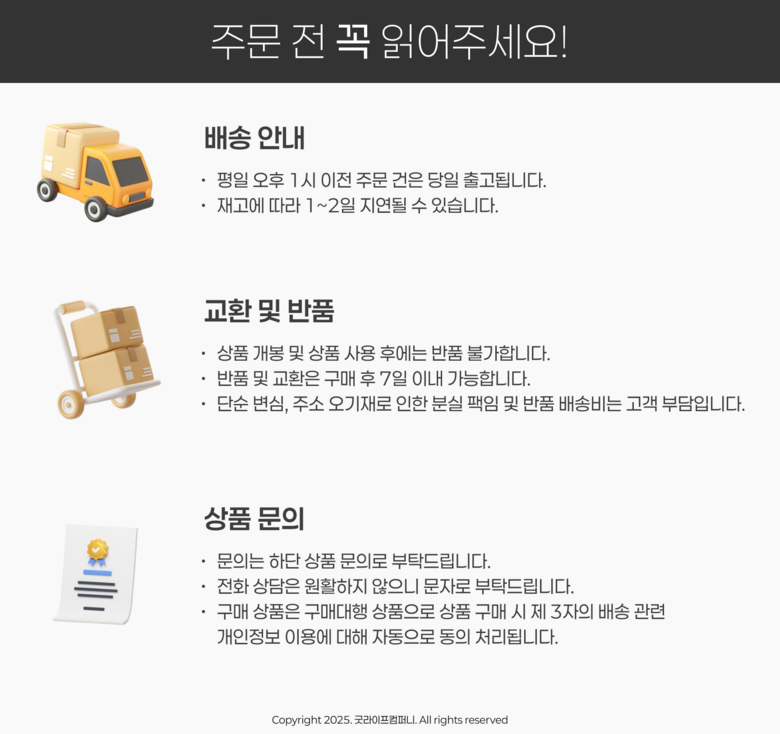| 배송방법 | 순차배송 | 배송비 | 무료배송 - 도서산간 지역 배송불가 |
