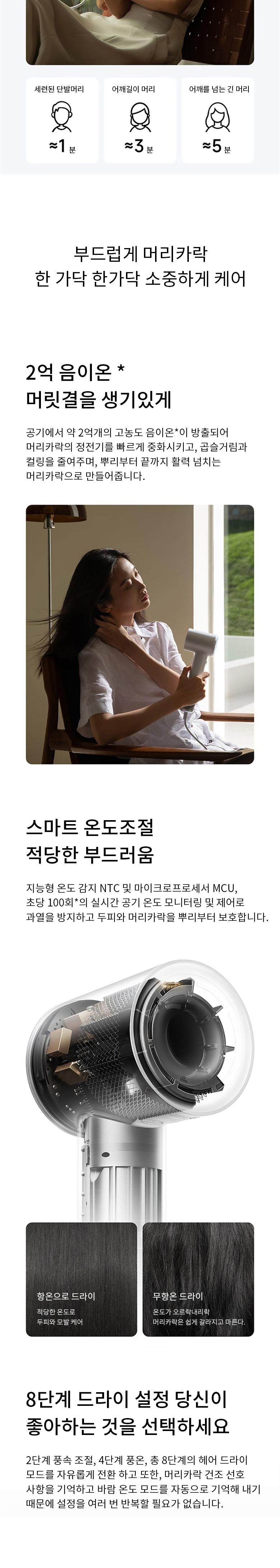 공기 중 약 2억 개의 고농도 음이온*을 동시에 방출하여 머리카락의 정전기를 빠르게 중화시키고 곱슬거림과 컬링을 줄여줍니다. 스마트 온도 감지 NTC와 마이크로프로세서 MCU는 1초에 100회* 실시간으로 공기 온도를 모니터링하고 제어하여 온도가 너무 높아지는 것을 방지하고 두피와 머리카락을 뿌리부터 보호합니다. 바람 온도를 시각적으로 표시, 4단계 색상 변경 조명 링이 바람에 따라 움직이며 온도 변화를 즉시 알려 주므로 안심하고 머리카락을 말릴 수 있습니다. 머리카락 흡수 방지 설계 이중 층 미세 다공성 공기 흡입구 그물로 머리카락 흡수를 방지합니다.