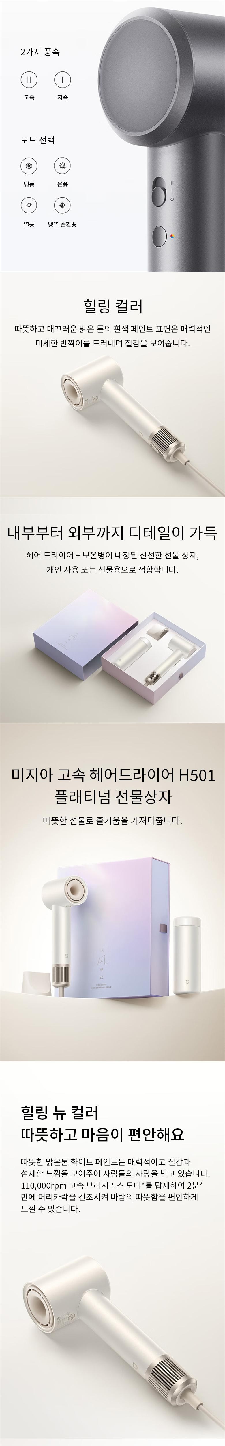 미지아 고속 헤어드라이어 H501(웜 마운틴 화이트) x1, 사용 설명서 x1, 공기 수집 노즐 x1