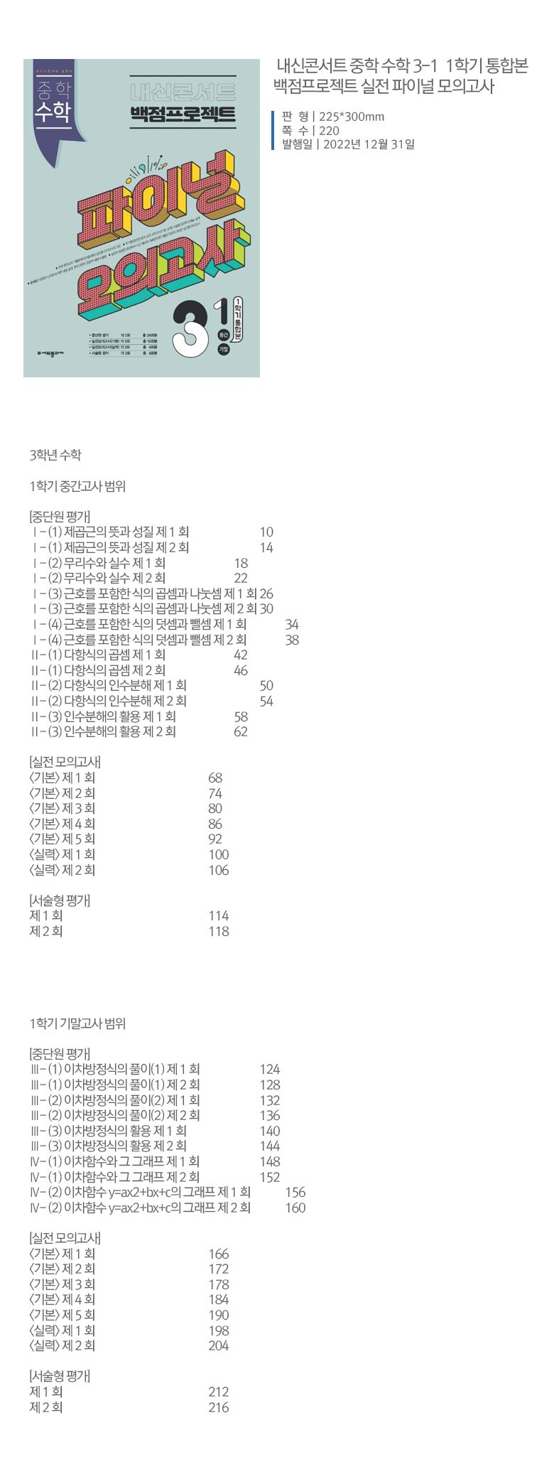 | 도서명 | 내신콘서트 백점프로젝트 실전 파이널 모의고사 중학 수학 3-1 중간 기말 1학기 통합본 | 저자, 출판사 | 에듀플라자, 에듀플라자 |