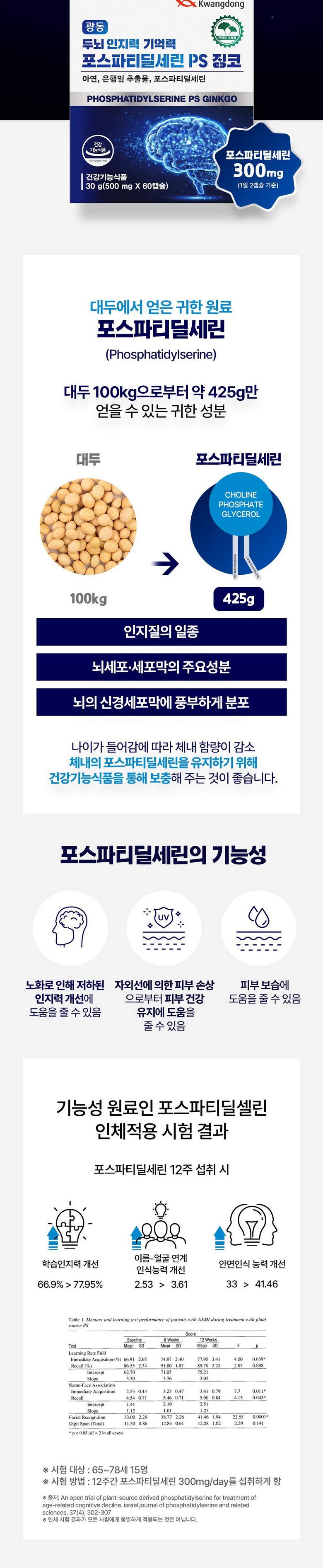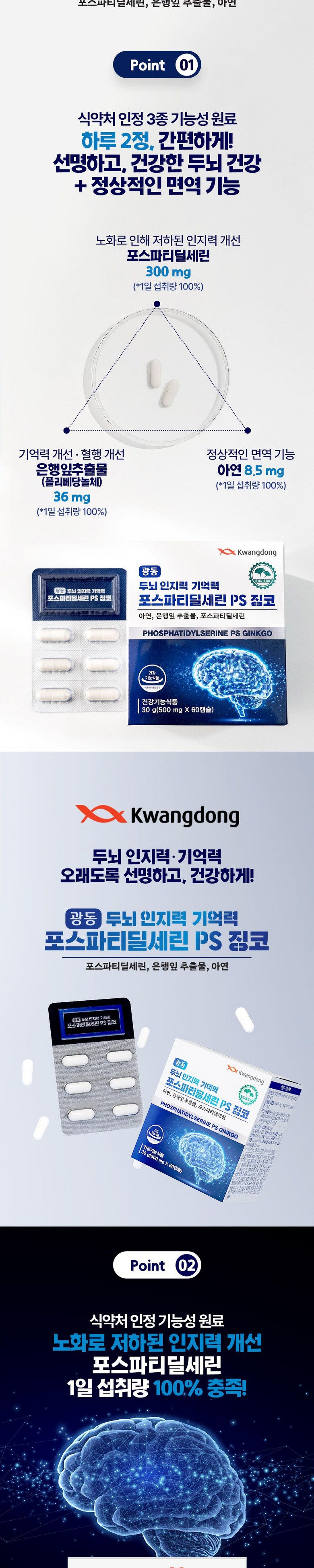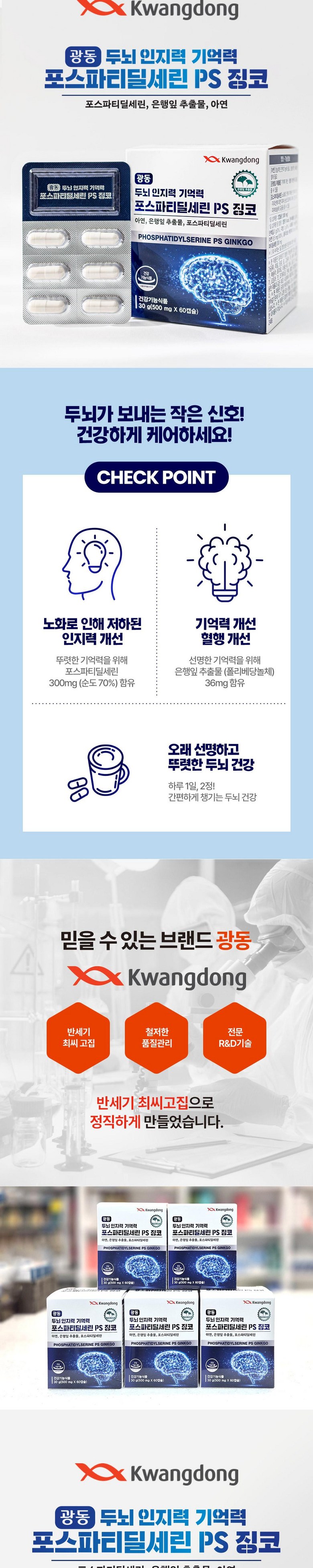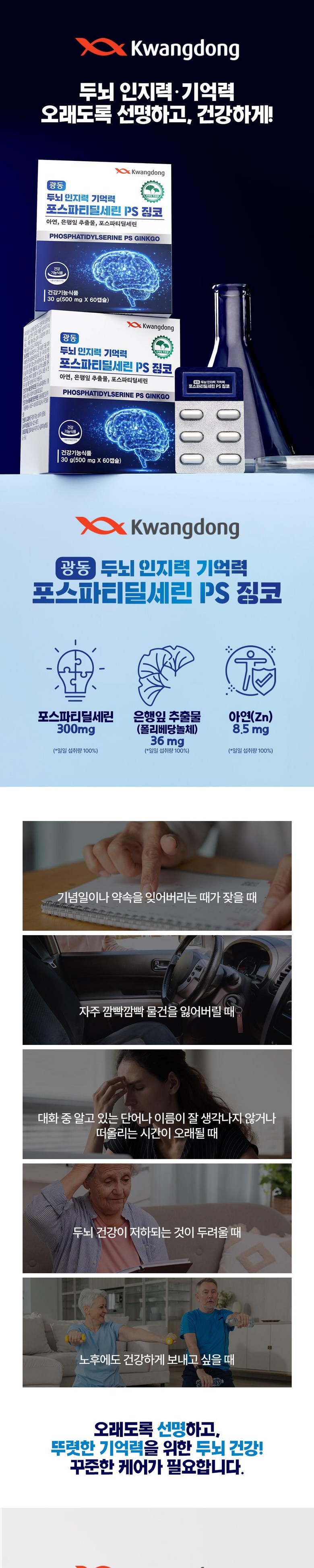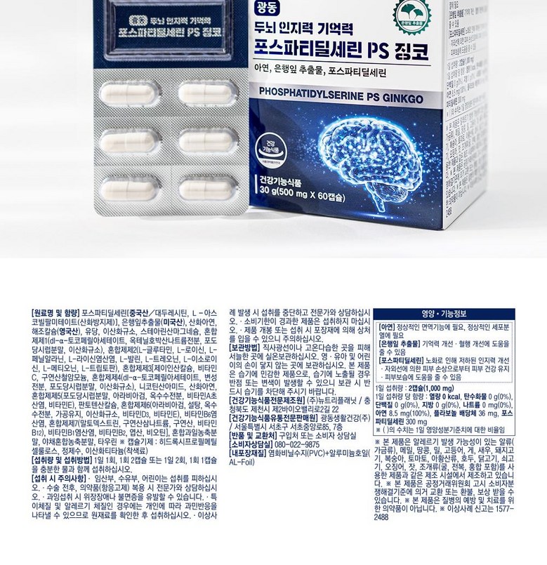 | 제품명 | 광동 두뇌 인지력 기억력 포스파티딜세린 PS 징코 | 제조업소의 명칭과 소재지 | (주)뉴트리플래닛/충청북도 제천시 제2바이오밸리로2길 22 |