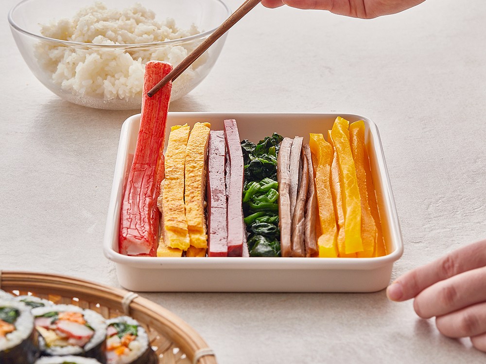 김밥 속 단골 재료, 맛살이에요. 탱글탱글한 식감과 달짝지근한 풍미가 일품이죠. 게엑기스를 더해 구수한 감칠맛을 선사한답니다. 잘게 잘라 볶음밥에 넣어도 맛있고, 마요네즈와 버무려 샐러드로 즐겨도 좋아요.
