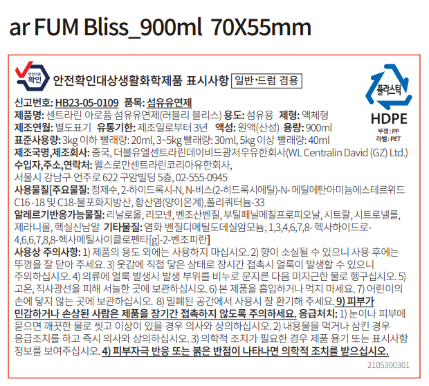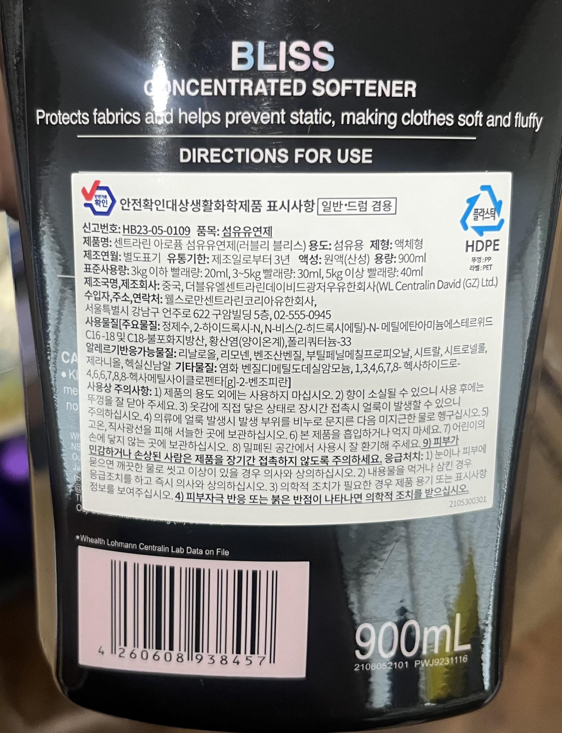 | 품목 및 제품명 | 섬유유연제 / 센트라린 아로퓸 섬유유연제(러블리 블리스) | 용도(표백제의 경우 계열을 함께표시) 및 제형 | 섬유용 / 액체형 |