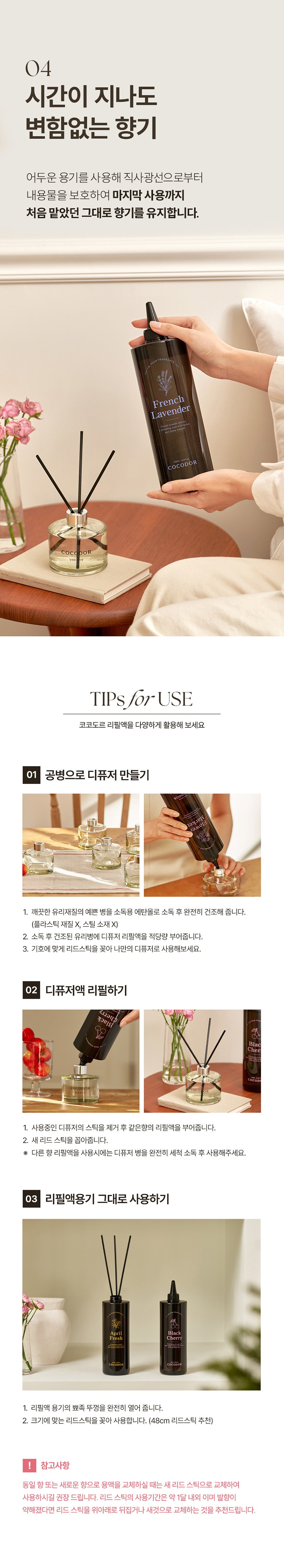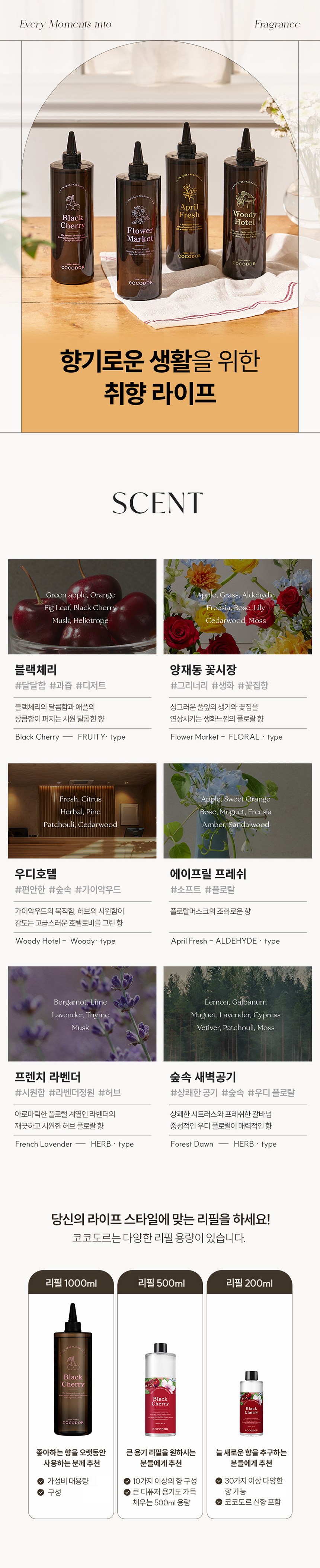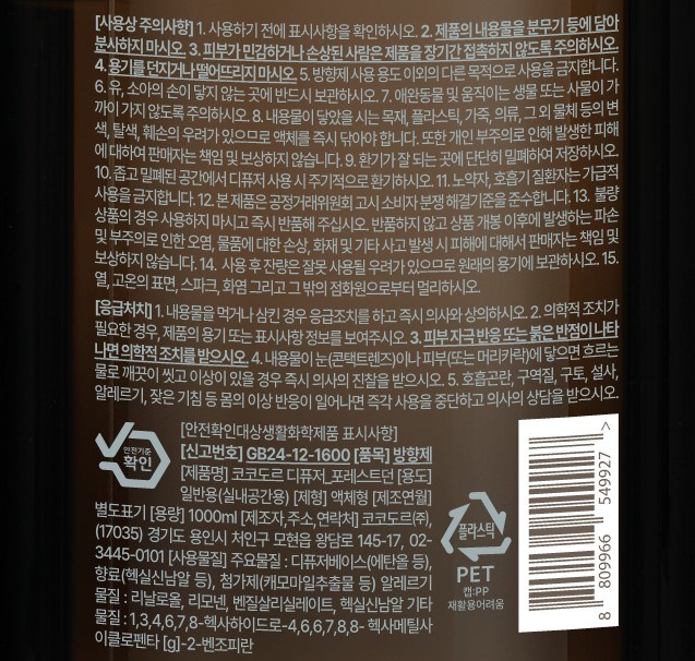| 품목 및 제품명 | 방향제 / 코코도르 디퓨저_포레스트던 | 용도(표백제의 경우 계열을 함께표시) 및 제형 | 일반용 (실내공간용) / 액체형 |