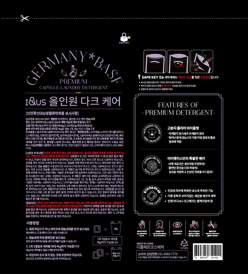 | 품목 및 제품명 | 세탁세제 / 아이앤어스 올인원 다크 케어 캡슐세제 | 용도(표백제의 경우 계열을 함께표시) 및 제형 | 섬유 얼룩제거용, 섬유용, 신발용 / 캡슐형 |