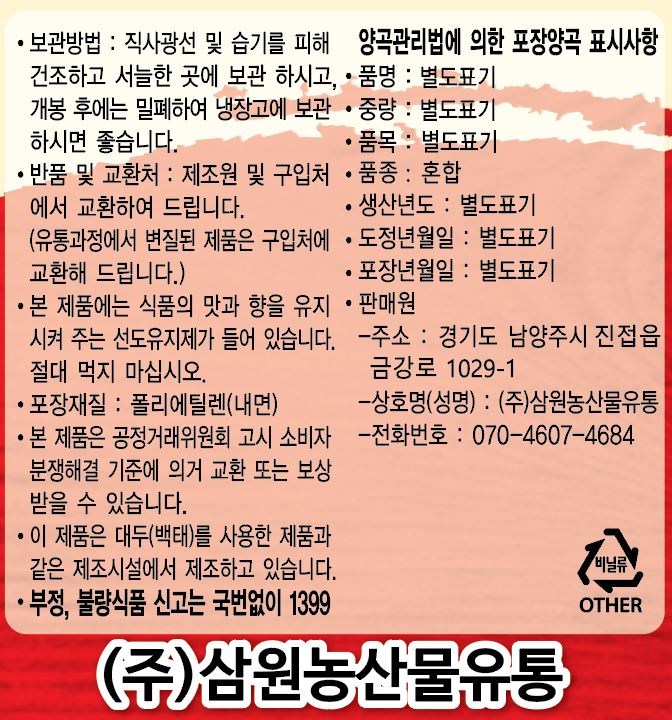 | 제조연월일, 소비기한 또는 품질유지기한 | 제조년월일 : 2025년 10월 15일 이후인 제조상품<br />생산일자 : 2025 | 세부 품목군별 표시사항 | 농수산물 : 유전자변형(해당 없음) / 지리적 표시사항(해당 없음) |