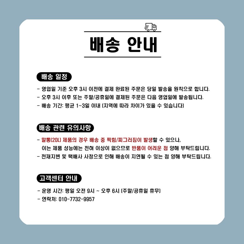 | 배송기간 | ㆍ도서산간 지역 등은 배송에 3-5일이 더 소요될 수 있습니다. - 천재지변, 물량 수급 변동 등 예외적인 사유 발생 시, 다소 지연될 수 있는 점 양해 부탁드립니다. | ||