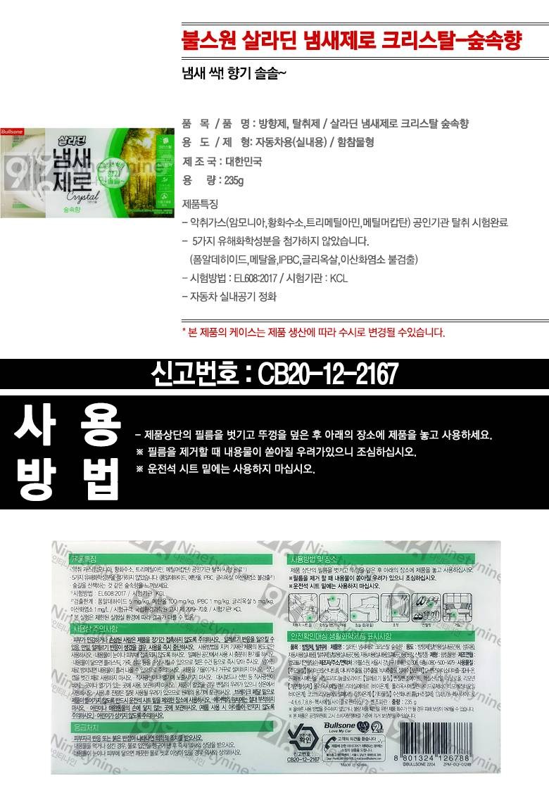 | 품목 및 제품명 | 방향제 / 살라딘 냄새제로 크리스탈 숲속향 | 용도(표백제의 경우 계열을 함께표시) 및 제형 | 일반용 (섬유용),일반용 (실내공간용),일반용 (밀폐공간용 (옷장, 신발장)),자동차용 (실내용) / 함침물형 |