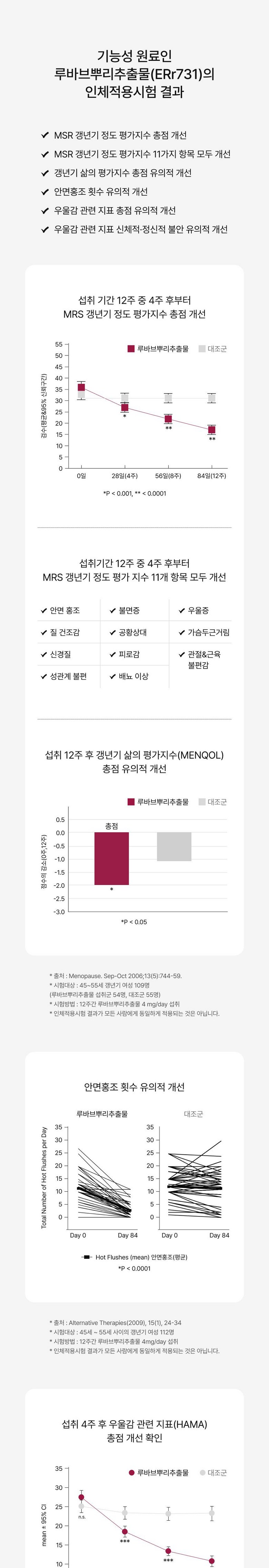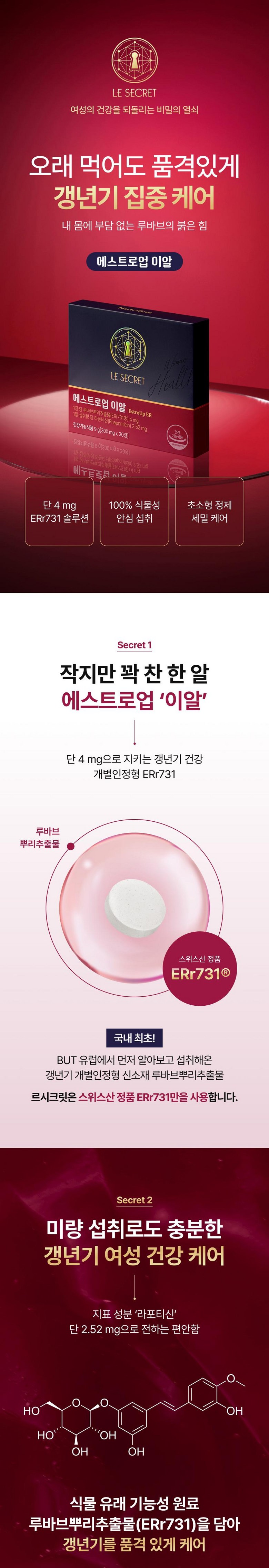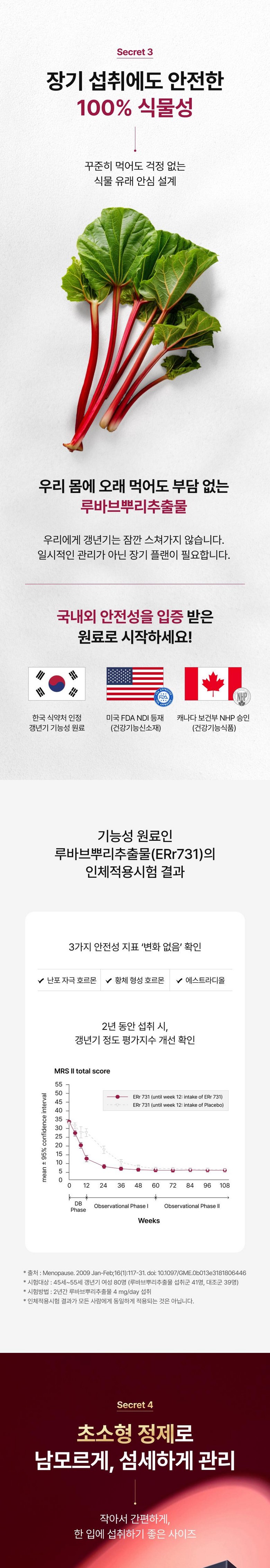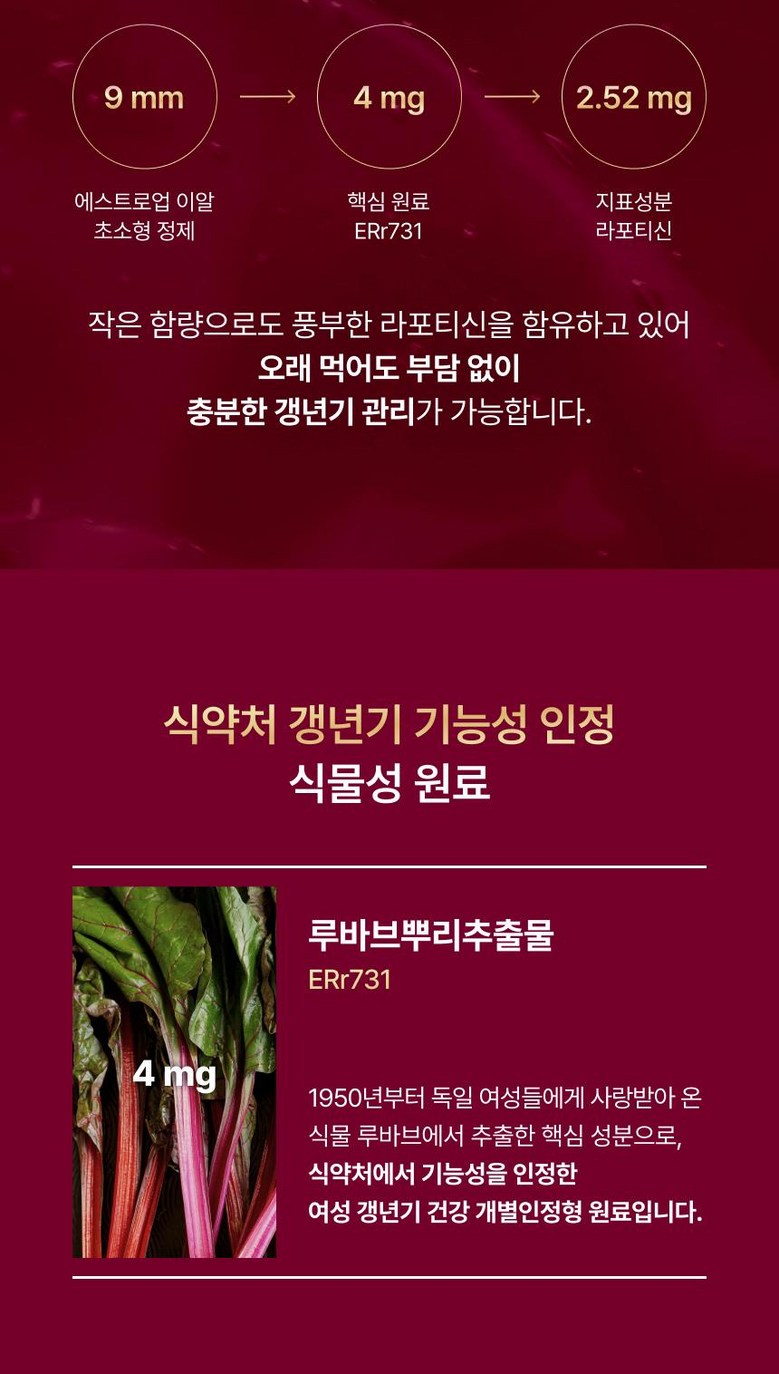 | 원료명 및 함량 | "루바브뿌리추출물(ERr731®)(제2024-17호)(스위스산), 결정셀룰로스, 유당(독일산), 이산화규소, 스테아린산마그네슘, 히드록시프로필메틸셀룰로스, 글리세린초산지방산에스테르(우유 함유)" | 영양정보 | "루바브뿌리추출물(ERr731®)(제2024-17호)" |