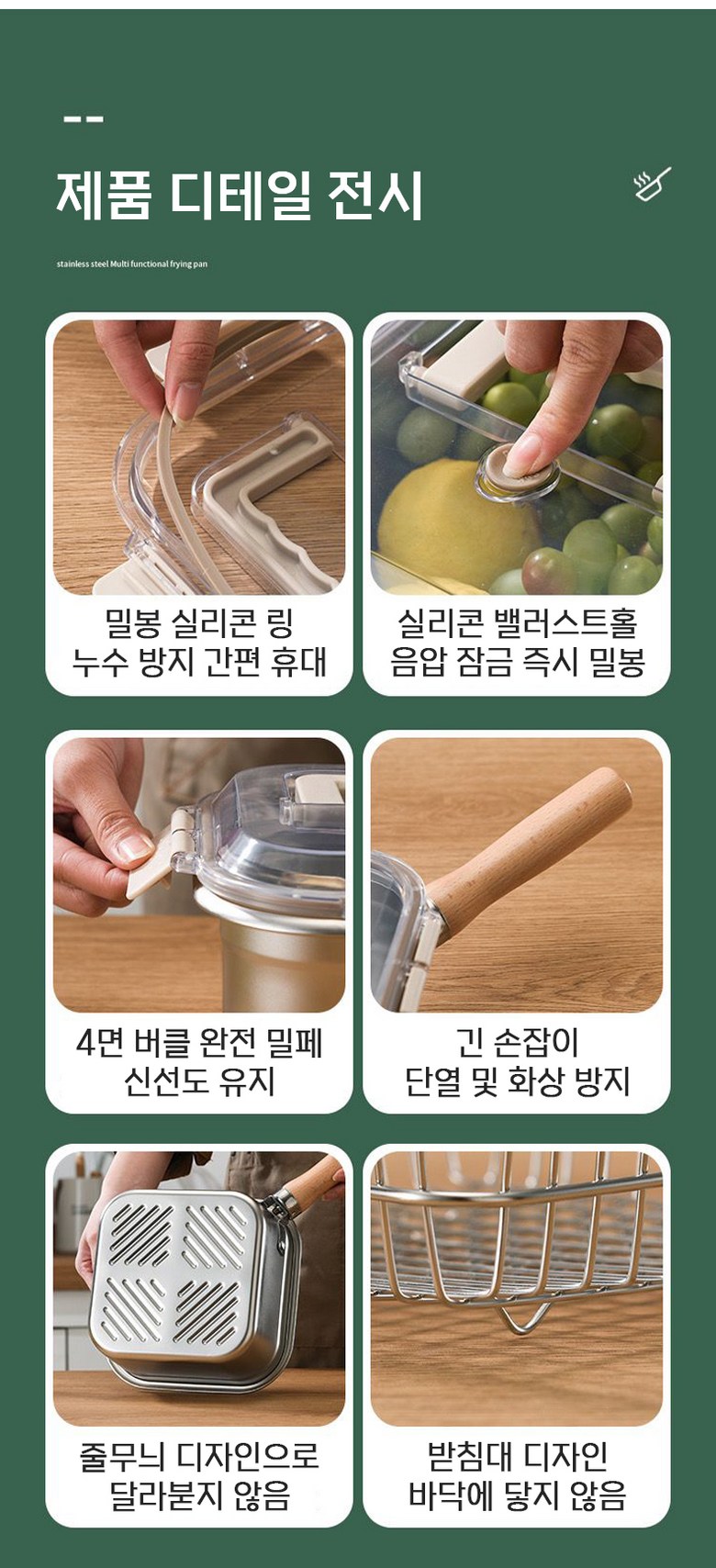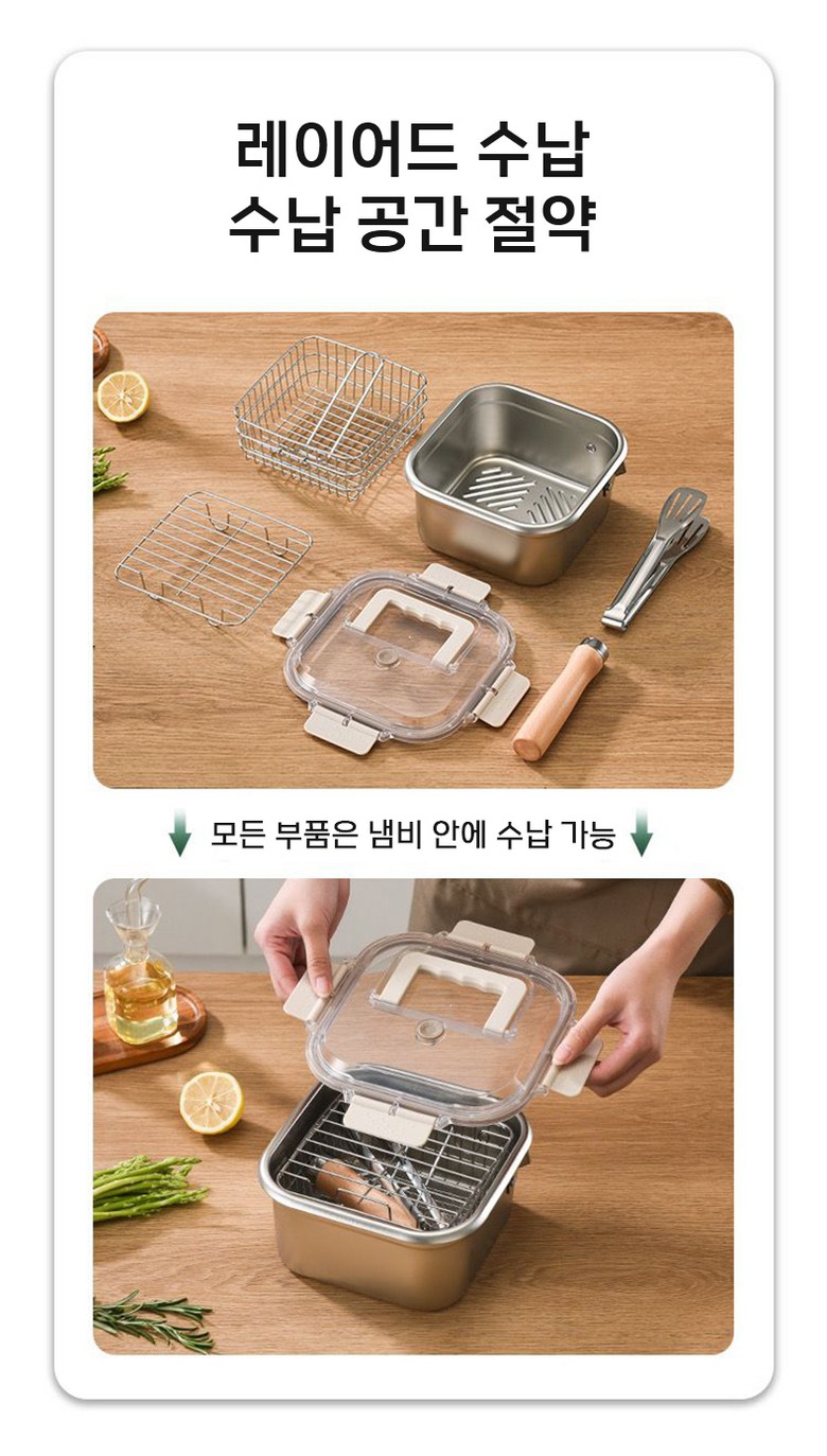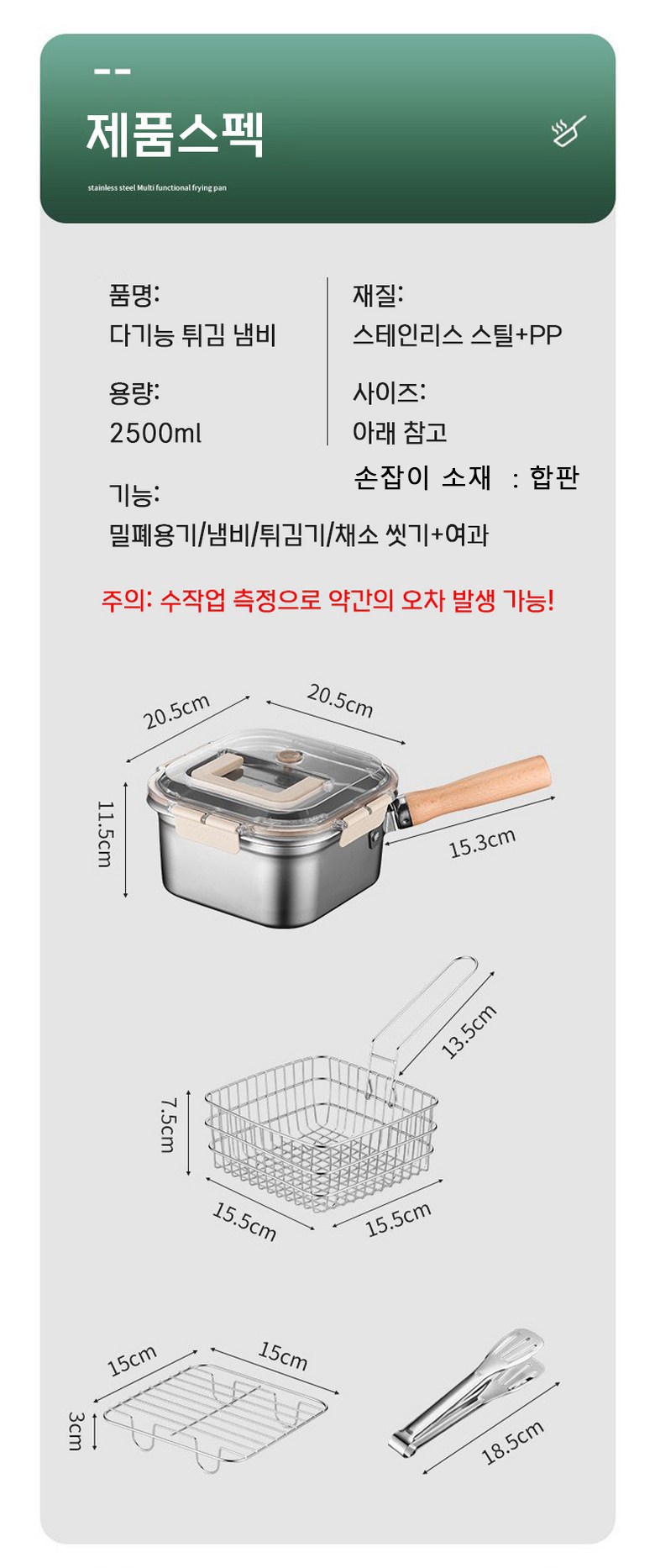 | 구성품 | 스텐용기, 밀폐뚜껑, 손잡이, 튀김바스켓, 불판, 집게 | 크기 | 20cm*20cm*10cm |