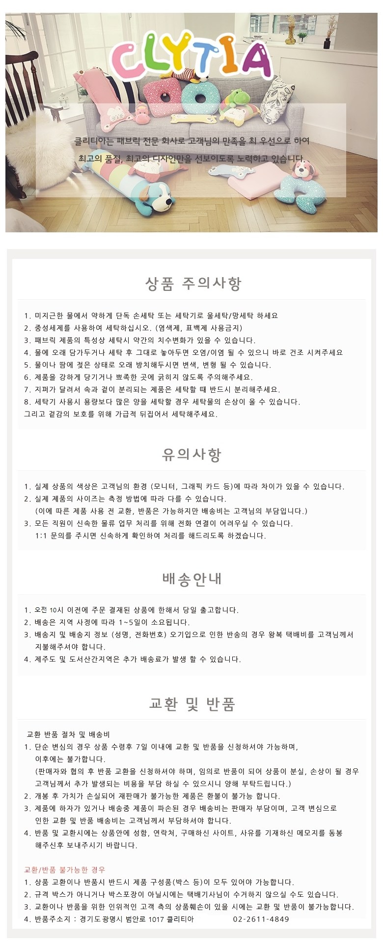 - ㆍ모니터 해상도의 차이로 인해 색상이나 이미지가 실제와 달라, 고객이 단순 변심으로 교환/반품을 무료로 요청하는 경우