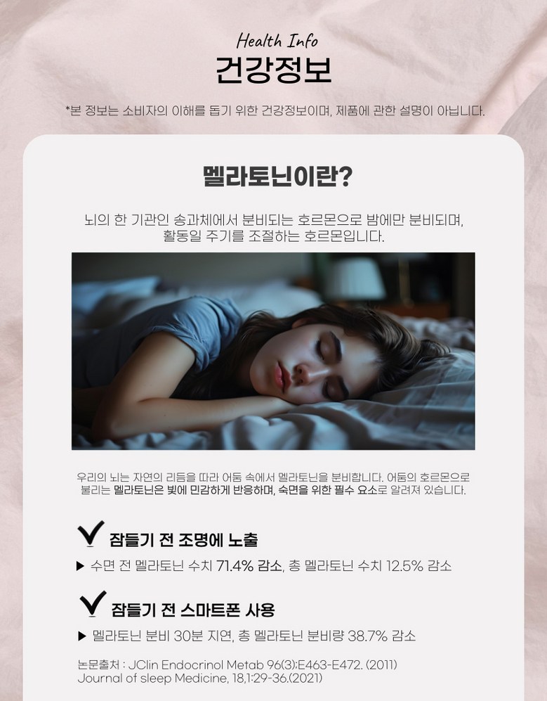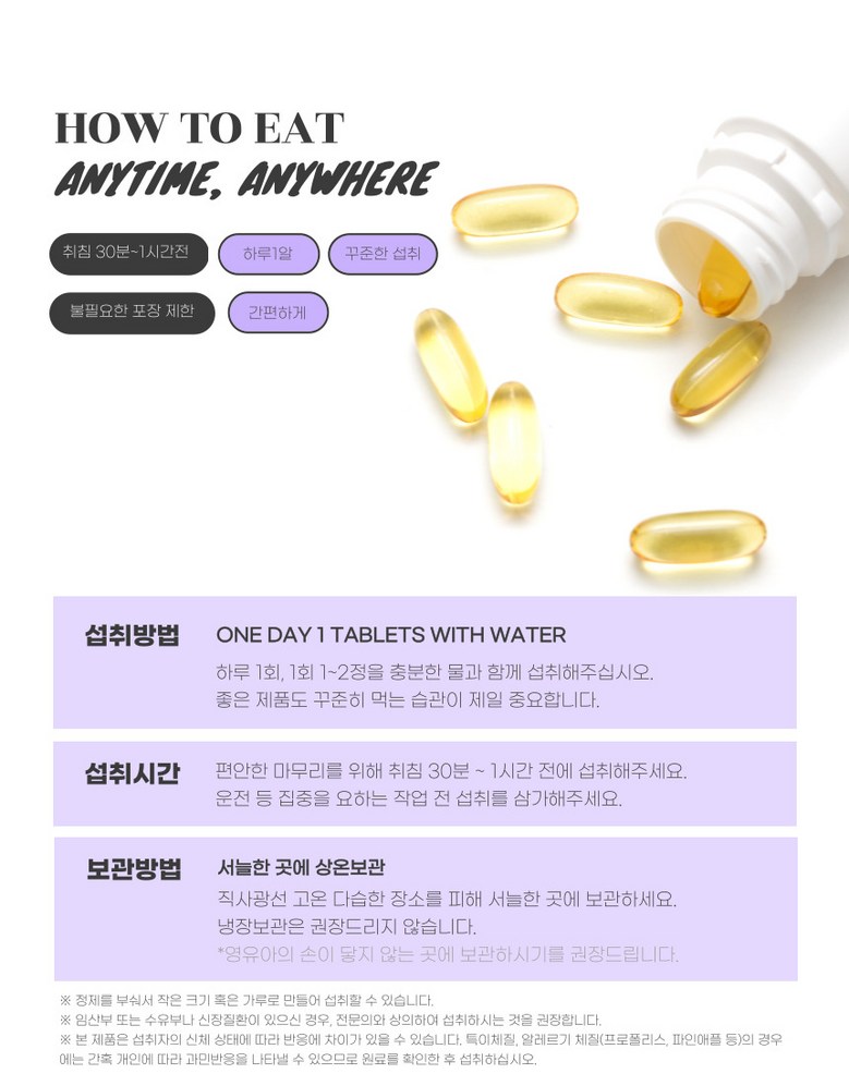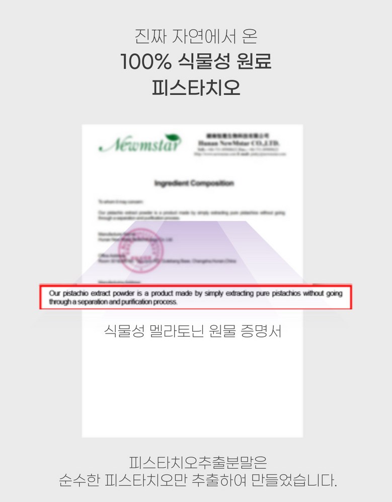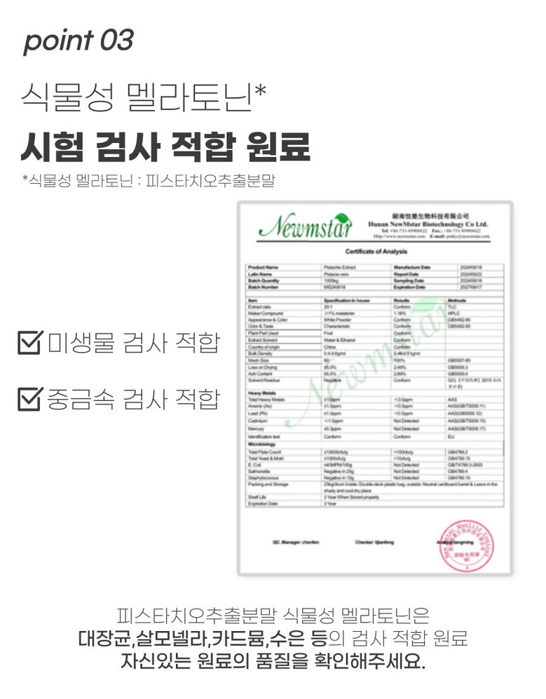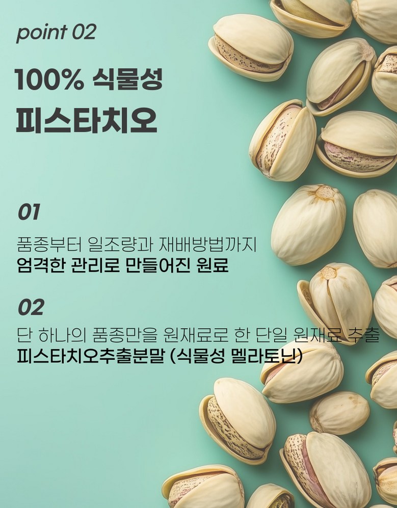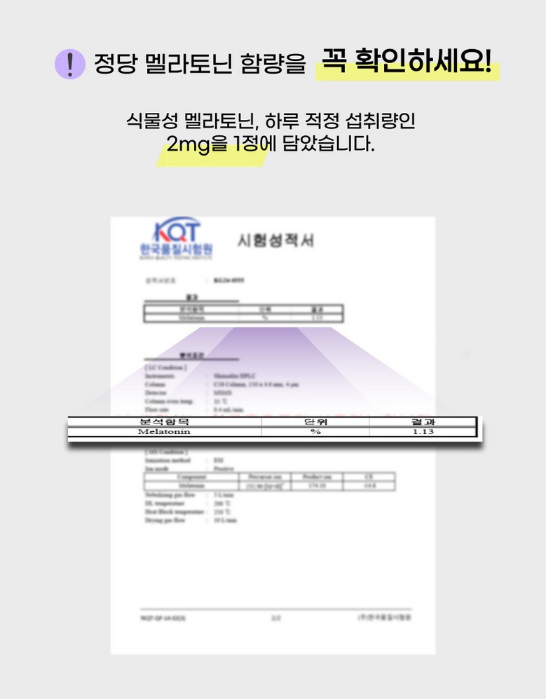 | 포장단위별 내용물의 용량(중량), 수량 | 30정 | 원재료명 및 함량 | 피스타치오 추출분말[피스타치오추출물(고형분함량100%/중국산)90%, 말토덱스트린]33.4%, 타트체리농축분말K[타트체리농축액(튀르키예산/고형분:10%)71.9%,덱스트린,아라비아검]30%, 화이브로우즈 에프90(치커리식이섬유)(치커리뿌리추출물100%/벨기에산), L-트립토판, L-테아닌, 캐모마이추출분말(캐모마일/크로아티아산), 로즈마리추출분말(로즈마리/이집트산), 이노시톨, 유단백가수분해물(락티움), 이산화규소, 스테아린산마그네슘 우유 함유 |
