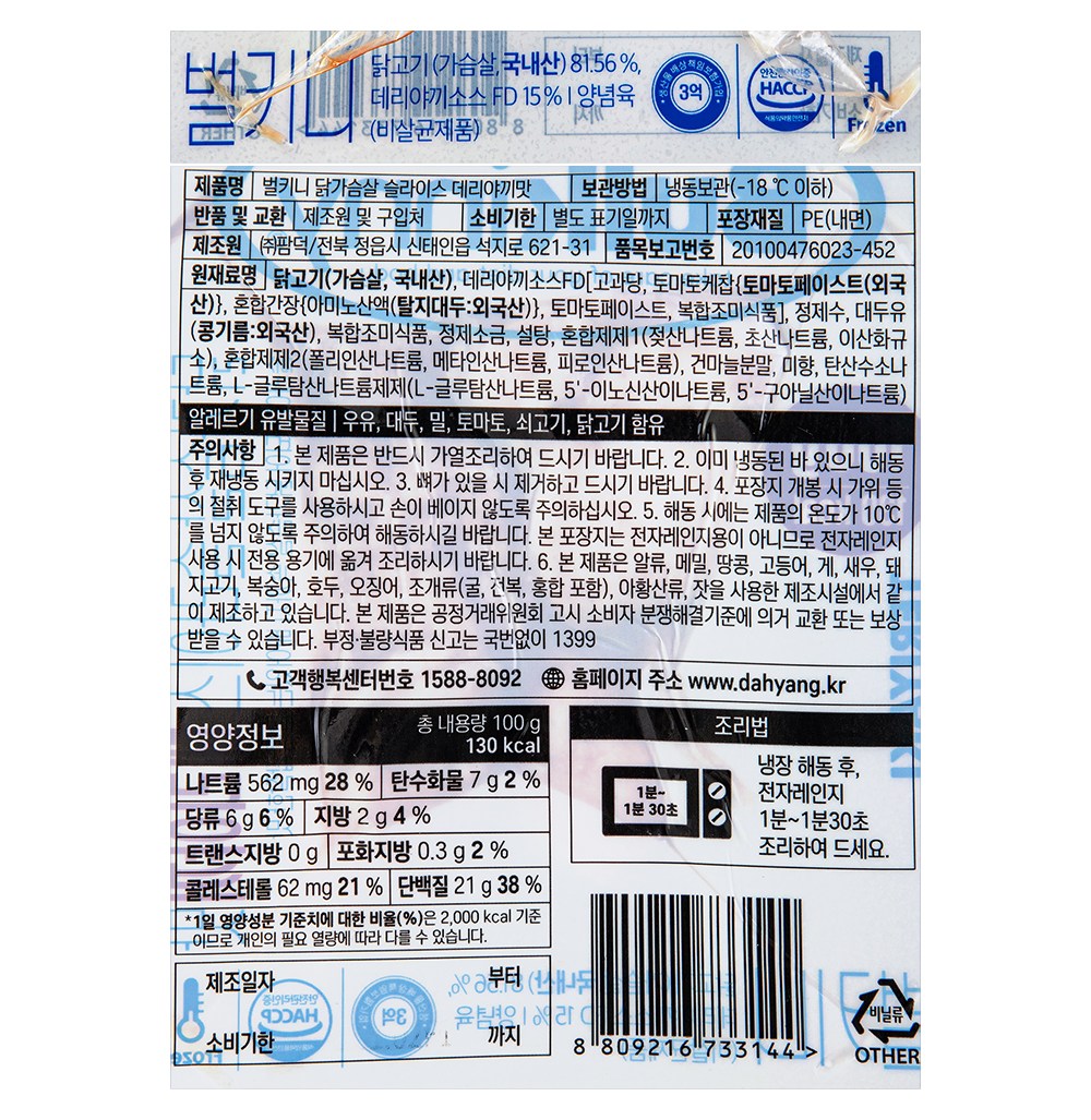 퍽퍽하기만 한 닭가슴살은 이제 그만. 부드러운 식감을 살린 닭가슴살 슬라이스예요. 먹기 좋은 두께로 썰려 있어 따로 손질 없이 드실 수 있는데요. 달짝지근한 데리야끼맛으로, 그대로 먹어도 맛있답니다. 전자레인지로 조리할 수 있어 간편해요.
