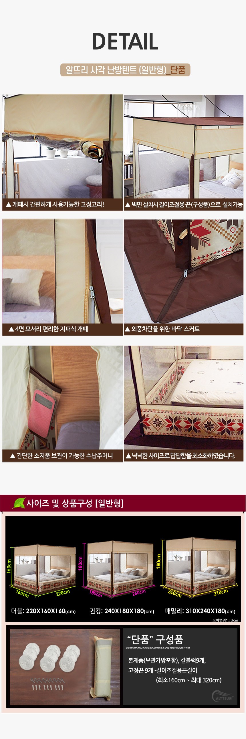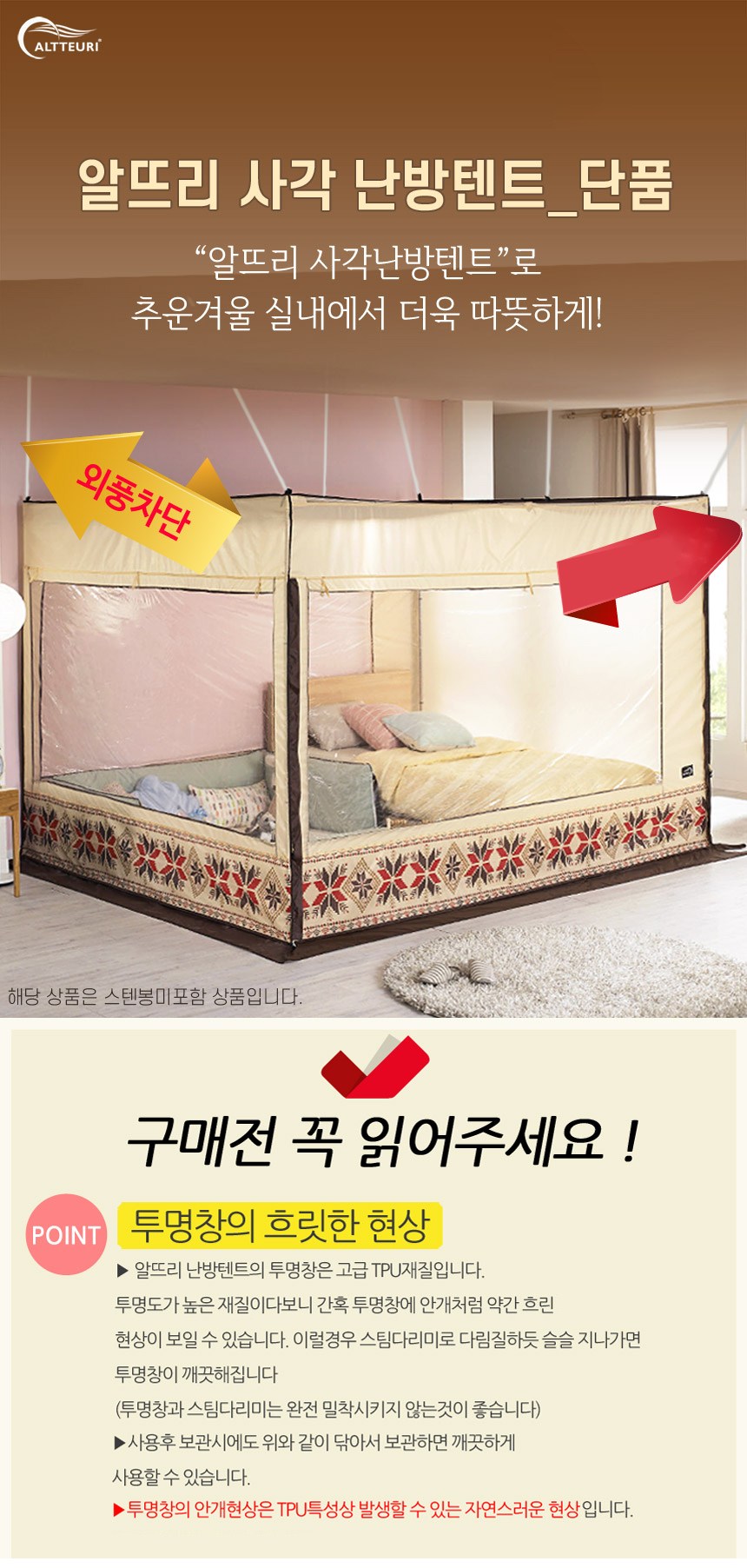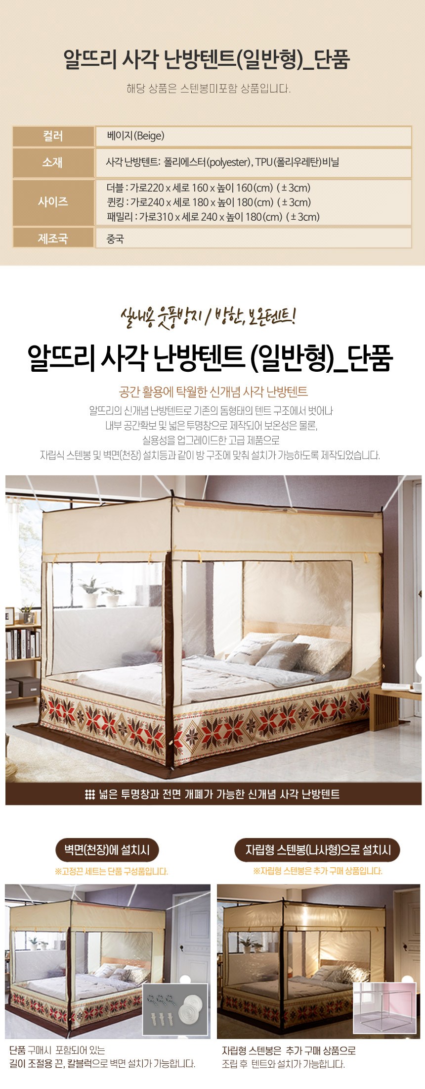 | 제품 소재 | 알뜨리 사각 난방텐트 베이지 일반형 더블 단품 | 색상 | 컨텐츠 참조 |